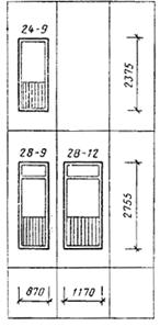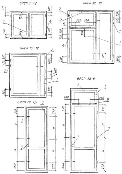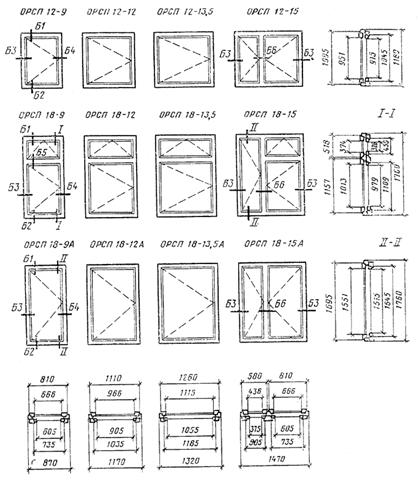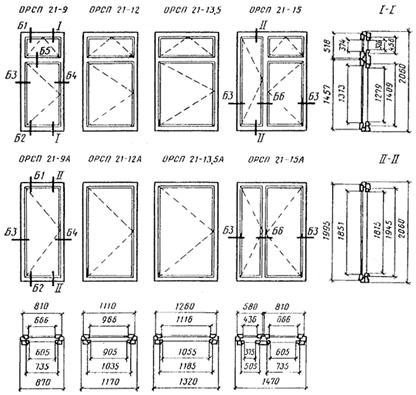 Черт. 18 Конструкция, форма, основные размеры и марки окон и балконных дверей общественных зданий