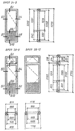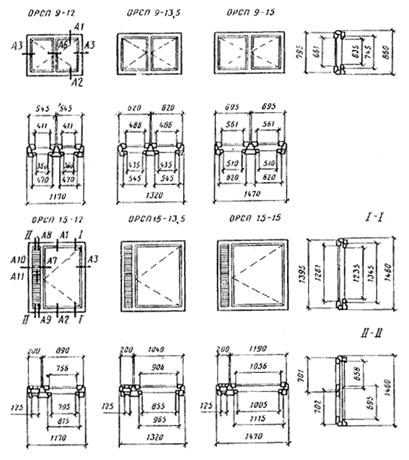 Примеры условных обозначений (марок) Окно правое серии РСП для проема высотой 15 и шириной 9 дм: ОРСП15—9 ГОСТ 24699-81 То же, левое: ОРСП15— 9Л ГОСТ 24699-81 Дверь балконная правая серии РСП для проема высотой 22 и шириной 9 дм: БРСП22—9 ГОСТ 24699-81 Окно серии РСП для проема высотой 18 и шириной 15 дм, с несимметричным рисунком (вариант А): ОРСП18—15А ГОСТ 24699-81 То же. в негативном (зеркальном) исполнении: ОРСП18—15АН ГОСТ 24699-81 Габаритные размеры окон и балконных дверей жилых зданий Окна