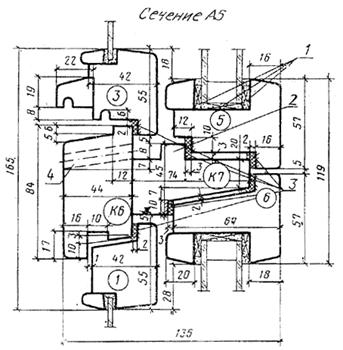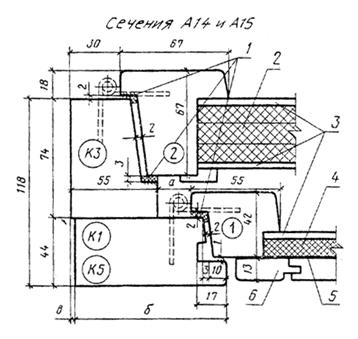 1 — уплотняющие прокладки по ГОСТ 10174; 2 — мягкая ДВП толщиной 12 мм, 3 слоя, по ГОСТ 4598-74 (вариант: допускается заполнение минераловатными полужесткими плитами на синтетическом связующем по ГОСТ 9573); 3 — твердая ДВП марки Т группы А толщиной 3,2 мм по ГОСТ 4598; 4 — мягкая ДВП толщиной 12 мм по ГОСТ 4398; 5 — пергамин по ГОСТ 2697; 6 — обшивка типа О-2 по ГОСТ 8242 Черт. 16
