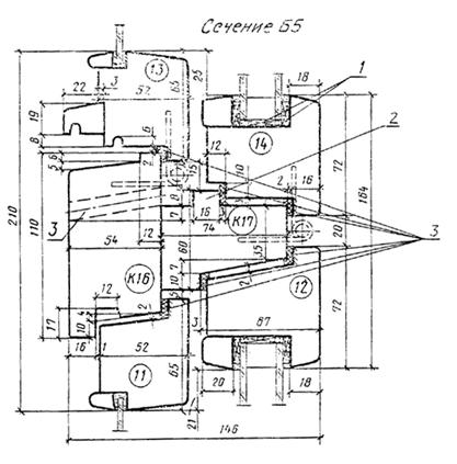 1 — уплотняющие прокладки по ГОСТ 10174; 2 — мягкая ДВП толщиной 12 мм, 4 слоя, по ГОСТ 4698 (вариант: допускается заполнение полужесткими минераловатными плитами на синтетическом связующем по ГОСТ 9573); 3 — твердая ДВП толщиной 3,2 мм по ГОСТ 4598 марки Т группы А Черт. 12