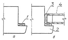 1 — опорные, распорные и боковые прокладки; 2 — рейка, допускается приклеивание рейки с дополнительным креплением шурупами (см черт. 7. вариант); 3 — уплотняющие прокладки по ГОСТ 10174; 4 — отверстие диаметром 10 мм для отвода воды (см. п. 2.4) Черт. 9