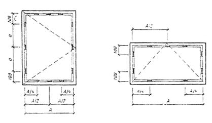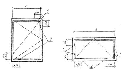 1 — распорная прокладка 5´В´50 (В — толщина стеклопакета): 2 — опорная прокладка 5´В´100 (В — толщина стеклопакета) б) Боковые прокладки (4´15´50) мм
