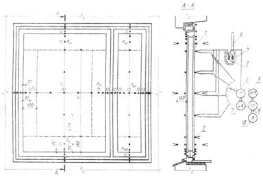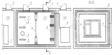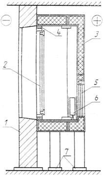 1 — стена, разделяющая в климатической камере теплое отделение от холодного; 2 — испытываемая светопрозрачная конструкция; 3 — вспомогательная камера, стенки которой состоят из внешних фанерных обшивок и внутреннего слоя из пенополистирола; 4 — эффективный теплоизоляционный материал (пенополистирол); 5 — смотровое окно с четверным остеклением; 6 — нагреватель с экраном; 7 — подставка. |