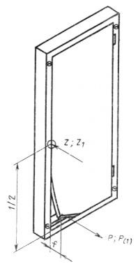 3. АППАРАТУРАДля испытания применяют: 1) испытательный стенд, состоящий из конструкции для жесткого закрепления дверной коробки по периметру и нагружающего устройства с погрешностью измерения нагрузки не более 2%; 2) измерительное устройство линейных перемещений с погрешностью измерения не более 0,5 мм; 3) секундомер; 4) штангенглубиномеры по СТ СЭВ 704-77, СТ СЭВ 708-77; 5) щупы плоские. 4. ПРОВЕДЕНИЕ ИСПЫТАНИЯ4.1. Образец устанавливают в испытательный стенд. Коробку закрепляют неподвижно. Производят проверку формы и размеров створки по СТ СЭВ 4181-83 и СТ СЭВ 4182-83. 4.2. Створку прижимают к коробке на середине высоты с силой Z = 1,2 Р или Z1 = 1,2 Р(1), где Р(1) - ожидаемая предельная нагрузка (см. чертеж).