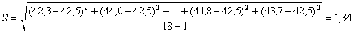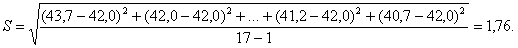 Среднее значение активности цемента в возрасте 28 сут по формуле (1) `Х=(42,3+44,0+...+41,8+43,7):18=42,5 МПа. Среднее квадратическое отклонение по формуле (2)