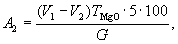 где V - объем 1 н раствора соляной кислоты, пошедший на титрование, мл; ТСаО - титр 1 н раствора соляной кислоты выраженный в г СаО; G - масса навески извести, г. 2.2.2.2. Определение содержания активной окиси магния трилонометрическим методом. Массу навески извести 0,5 г помещают в стакан вместимостью 200 - 250 мл, смачивают ее водой и прибавляют 30 мл 1 н соляной кислоты. Стакан закрывают часовым стеклом и нагревают в течение 8 - 10 мин до температуры кипения, затем часовое стекло ополаскивают дистиллированной водой и после охлаждения раствор переливают в мерную колбу вместимостью 250 мл, доливают дистиллированной водой до метки и тщательно перемешивают. После отстаивания раствора отбирают пипеткой 50 мл, переносят в коническую колбу вместимостью 250 мл и добавляют 50 мл дистиллированной воды, 5 - 10 мл аммиачного буферного раствора, 5 - 7 капель кислотного хром темно-синего индикатора и титруют при сильном взбалтывании 0,1 н раствором трилона Б до перехода красной окраски раствора в сине-зеленую или синюю. По окончании титрования отмечают объем V1 израсходованного трилона Б в миллилитрах. Из этой же мерной колбы отбирают 50 мл раствора в коническую колбу вместимостью 250 мл, приливают 100 мл дистиллированной воды и перемешивают. Затем добавляют 3 мл триэтаноламина, 25 мл 20 %-ного раствора едкого калия и вновь перемешивают. Через 1 - 2 мин добавляют на кончике шпателя флуорексон и титруют раствором трилона Б до перехода флуоресцирующей розово-зеленой окраски раствора в устойчивую розовую при наблюдении на черном фоне. Отмечают объем V2 израсходованного раствора трилона Б в миллилитрах. Содержание активной окиси магния А2 в процентах вычисляют по формуле