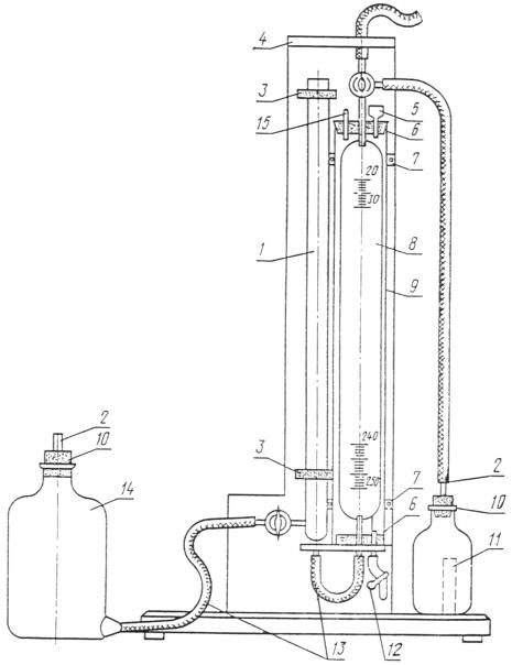 где G - масса навески извести, г (п. 2.3.1); G2 - масса навески после прокаливания при 520 °С, г; G3 - масса навески после прокаливания при 975 °С, г. 2.4. Определение содержания СО2 в извести на кальциметре газообъемным методом (экспресс-метод) Газообъемный метод основан на измерении выделившегося углекислого газа в результате воздействия соляной кислоты на корбонаты кальция и магния. Кальциметр изготовляется в соответствии с требованиями действующих нормативных документов (черт. 1). Применяемые реактивы и растворы. Соляная кислота по ГОСТ 3118-67, плотностью 1,19 и раствор ее 1:1. Хлористый натрий по ГОСТ 4233-77, насыщенный водный раствор; готовят следующим образом: 400 г хлористого натрия растворяют в 1 л дистиллированной воды. 2.4.1. Определение герметичности прибора Проверку прибора на герметичность производят следующим образом. Склянку с пробиркой 11 закрывают пробкой 10, соединенной резиновой трубкой с бюреткой 8. Кран цилиндра 1 открывают, а кран бюретки переводят в вертикальное положение, соединяя бюретку и склянку с пробиркой с атмосферой. В мантию 9 бюретки наливают воду, а в склянку с тубусом 14 - подкрашенный насыщенный водный раствор хлористого натрия. Путем вертикального перемещения склянки с тубусом доводят уровень жидкости в бюретке до нулевой отметки, кран бюретки устанавливают в горизонтальном положении, перекрывая выход в атмосферу и соединяя бюретку и склянку с пробиркой. Затем уровень жидкости в цилиндре при помощи склянки с тубусом доводят до отметки 120 - 130 мл (по шкале бюретки), закрывают кран цилиндра и оставляют прибор в таком состоянии на несколько часов. Если уровень жидкости в бюретке изменяется, то необходимо проверить на герметичность все соединительные части: трубки, краны, пробки. Кальциметр 1 - цилиндр с краном; 2 - отводная трубка; 3 - клеммы для цилиндра; 4 - подставка; 5 - воронка; 6 - резиновая пробка к мантии; 7 - клемма для мантии; 8 - бюретка с краном; 9 - мантия; 10 - резиновая пробка № 20 - 22; 11 - склянка с пробиркой; 12 - пружинный зажим; 13 - соединительная резиновая трубка; 14 - склянка с тубусом; 15 - отверстие для термометра Черт. 1 2.4.2. Проведение анализа Массу навески около 1 г помещают в склянку с пробиркой, добавляют 3 - 5 стеклянных бус или оплавленных стеклянных палочек длиной 5 - 7 мм и при помощи воронки в пробирку наливают около 10 мл раствора соляной кислоты 1:1. Склянку с пробиркой закрывают пробкой, соединенной резиновой трубкой с бюреткой. Во время проведения опыта склянку с пробиркой необходимо брать только за горлышко. Кран бюретки устанавливают в вертикальное положение, соединяя бюретку и склянку с пробиркой с атмосферой. Открывают кран цилиндра и, изменяя высоту положения склянки с тубусом, уровень жидкости в цилиндре и бюретке устанавливают на отметке 20 мл. После этого кран цилиндра закрывают, а кран бюретки переводят в горизонтальное положение, перекрывая атмосферу от склянки с пробиркой и бюретки. Для соединения навески с кислотой склянку с пробиркой при открытом кране цилиндра наклоняют и встряхивают. В результате взаимодействия карбонатной составляющей пробы с соляной кислотой выделившийся СО2 попадает в бюретку, вытесняя из нее жидкость в цилиндр и склянку с тубусом. Для охлаждения склянку с содержимым помещают в сосуд с водой, имеющей температуру воды в мантии бюретки. После стабилизации столба жидкости в бюретке, т.
