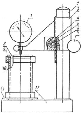 где G1 - разность в массе тигля с навеской до и после прокаливания, в г; G - масса навески гипса, г. 8. ОПРЕДЕЛЕНИЕ ОБЪЕМНОГО РАСШИРЕНИЯ8.1. Аппаратура Прибор ГОИ (Государственного оптического института) (черт. 9) состоит из штатива, на котором укреплен индикатор, и разъемного металлического цилиндра, скрепляемого при сборке кольцами. Внутренний диаметр цилиндра - 50 мм, наружный - 56 мм, высота - 100 мм. 1 - индикатор; 2 - стойка; 3 - кронштейн; 4 - рейка; 5 - зубчатое колесо; 6 - ось; 7 - винт; 8 - крышка; 9 - кольцо; 10 - цилиндр; 11 - стекло; 12 - основание. Черт. 9 Дюралевая крышка диаметром 56 мм, толщиной 1 мм. Стеклянная пластина. 8.2. Проведение испытания Прибор устанавливают на жестком основании, исключающем возможность вибрации. Цилиндр прибора ставят на стеклянную пластину, заполняют гипсовым тестом нормальной густоты, закрывают крышкой и устанавливают на опорной плите. Время затворения гипсового вяжущего водой и заполнения им цилиндра не должно превышать 2 мин. Стержень индикатора поворотом винта приводят в соприкосновение с углублением в крышке цилиндра. Дополнительно производят еще один оборот винта для установки индикатора на нулевое значение и приступают к фиксации движения стрелки, вызываемого расширением гипсового раствора при его твердении. Началом отсчета расширения следует считать момент появления положительных деформаций, концом определения - момент прекращения движения стрелки, наступающий примерно через 1 ч после заполнения цилиндра раствором. Величина объемного расширения в процентах численно равна величине деформации в мм. 9. ОПРЕДЕЛЕНИЕ ВОДОПОГЛОЩЕНИЯ9.1. Аппаратура Сушильный шкаф. Весы по ГОСТ 24104-80 с погрешностью взвешивания не более 0,01 г. 9.2. Проведение испытания Водопоглощение гипса определяют на трех образцах (половинках-балочках), предварительно высушенных до постоянной массы при температуре 318 - 328 К (45 - 55 °С). Образцы взвешивают, помещают в горизонтальном положении в ванну и заливают до половины водой. Через 2 ч их заливают водой полностью и выдерживают еще 2 ч. После этого образцы извлекают из воды, обтирают влажной тканью и взвешивают. Водопоглощение гипса W в процентах определяют по формуле