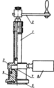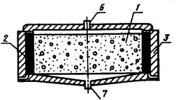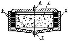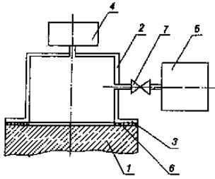 где Q - вес воды, поглощенной бетоном, Н; V - объем бетона, насыщенного водой, см3. Объем бетона V, насыщенного водой, определяют по формуле 9. Среднее значение коэффициента фильтрации бетона определяют по данным шести испытаний в соответствии с требованиями п. 3.4.4 настоящего стандарта. Приложение 4Рекомендуемое УСКОРЕННЫЙ МЕТОД ОПРЕДЕЛЕНИЯ ВОДОНЕПРОНИЦАЕМОСТИ БЕТОНА ПО ЕГО ВОЗДУХОПРОНИЦАЕМОСТИ1. Общие требования Метод учитывает общие требования ГОСТ 12730.0 и положения определения водонепроницаемости бетона по его воздухопроницаемости. 2. Отбор образцов 2.1. Размеры контрольных образцов - по п. 1.2 настоящего стандарта. Допускается испытывать образцы-кубы с ребром длиной 150 мм. Число образцов в серии - 6. 2.2. Изготовление контрольных образцов - по ГОСТ 10180, хранение и подготовка их к испытаниям - по пп. 1.4 и 2.2 настоящего стандарта. Примечание. При хранении образцов должна быть исключена возможность попадания воды на их поверхность. 3. Оборудование и материалы 3.1. Для проведения испытаний используют: устройство типа «Агама-2Р» для определения воздухопроницаемости бетона, принципиальная схема которого приведена на черт. 3; герметизирующую мастику, удовлетворяющую требованиям ГОСТ 14791. Принципиальная схема устройства для определения воздухопроницаемости поверхностных слоев бетона 1 - бетонный образец; 2 - камера устройства; 3 - фланец камеры; 4 - вакуумметрический датчик; 5 - вакуум-насос: 6 - герметизирующая мастика; 7 - вентиль 3.2. Допускается применять другие устройства, отвечающие основным требованиям: ширина фланца камеры устройства должна быть не менее 25 мм; начальное давление прижатия фланца камеры к поверхности бетона образца должно быть не менее 0,05 МПа; начальный уровень вакуумметрического давления, создаваемого внутри камеры, должен быть не менее 0,064 МПа; внутренний объем полости камеры устройства должен быть не менее 180 см3; при установке и герметизации устройства на поверхности непроницаемого материала (оргстекло по ГОСТ 9784 и др.) падение вакуумметрического давления не должно превышать 0,002 МПа в течение 1 ч. 4. Подготовка испытаний 4.1. Водонепроницаемость бетона определяют по табл. 7 или, в случае невозможности использования таблицы, по экспериментально устанавливаемой градуировочной зависимости. 4.2. Проверку возможности использования табл. 7 осуществляют в соответствии с пп. 7.1 и 7.2. Установление градуировочной зависимости - по пп. 7.3 - 7.6. 4.3. Проверку возможности использования значений табл. 7 проводят перед началом применения настоящего ускоренного метода и каждый раз при изменении вида и качества применяемых цемента, добавок и заполнителей. 4.4. Перед проведением испытаний устройство проверяют на герметичность в соответствии с инструкцией по эксплуатации. 5. Проведение испытаний 5.1. При испытании герметизирующую мастику жгутом диаметром не менее 6 мм укладывают на фланец камеры по его средней линии и соединяют концы. Камеру фланцем устанавливают на нижнюю (по условиям формования) поверхность образца и в полости камеры создают разрежение не менее 0,064 МПа. 5.2. В соответствии с инструкцией по эксплуатации устройства определяют значение параметра воздухопроницаемости бетона аi, см3/с, для каждого образца или обратное ему значение сопротивления бетона прониканию воздуха тi, с/см3. 6. Обработка результатов 6.1. Полученные значения аi (mi) бет