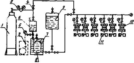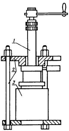 ПРИЛОЖЕНИЕ 1Рекомендуемое СХЕМЫ КРЕПЛЕНИЯ И ГЕРМЕТИЗАЦИИ ОБРАЗЦОВ БЕТОНА В ОБОЙМАХСпособ уплотнения боковой поверхности образца путем обжатия образцов набором чередующихся резиновых и металлических колец или завулканизированной стальной пружиной резиновым кольцом Способ уплотнения боковой поверхности образца путем заливки зазора между образцами и обоймой специальными мастиками Способ уплотнения боковой поверхности образца резиновой полой камерой с избыточным давлением в ней 1 - образец бетона; 2 - испытательная обойма; 3 - мастика; 4 - набор резиновых и металлических колец; 5 - резиновая полая камера; 6 - съемная крышка для подачи воды; 7 - съемная крышка с патрубком для сбора фильтрата Примечание. При определении водонепроницаемости методом «мокрого пятна» снимают крышку 7. ПРИЛОЖЕНИЕ 2Рекомендуемое ПРИНЦИПИАЛЬНАЯ СХЕМА УСТАНОВКИ ДЛЯ ОПРЕДЕЛЕНИЯ КОЭФФИЦИЕНТА ФИЛЬТРАЦИИ1 - баллон с газом; 2 - насос; 3 - редуктор; 4 - вентиль; 5 - манометр; 6 - передатчик давления; 7 - емкость с водой; 8 - эластичная емкость с дезаэрированной водой; 9 - запасная емкость с дезаэрированной водой; 10 - испытательное гнездо; 11 - измеритель веса фильтрата ПРИЛОЖЕНИЕ 3Рекомендуемое УСКОРЕННЫЙ МЕТОД ОПРЕДЕЛЕНИЯ КОЭФФИЦИЕНТА ФИЛЬТРАЦИИ (ФИЛЬТРАТОМЕТРОМ)1. Минимальный размер бетонных образцов для испытания должен быть 150 мм. 2. Хранение и подготовка к испытаниям бетонных образцов - в соответствии с пп. 3.2.1 и 3.2.2 настоящего стандарта. 3. Фильтратометр (см. черт. 1 настоящего приложения) устанавливают на нижнюю (при формовании) поверхность образца и закрепляют (см. черт. 2 настоящего приложения). 4. Давление воды в камере фильтратометра поднимают до 10 МПа вращением ручки насоса и оценивают скорость падения давления. 5. При быстром падении давления и невозможности его поддержания путем вращения ручки насоса испытания прекращают и коэффициент фильтрации бетона принимают большим наибольшего значения, указанного в табл. 6 настоящего стандарта (10-8 см/с). 6. При медленном падении давления отмечают положение ручки насоса, а время, соответствующее этому моменту, принимают за начало испытания. Ручкой насоса делают шесть полных оборотов, поддерживая давление в пределах (10±0,5) МПа, и испытания прекращают. Это время принимают за окончание испытания. По числу оборотов определяют вес воды, поглощенной бетоном, из расчета, что один полный оборот ручки насоса равен 9,63×10-3 Н. Фильтратометр ФМ-3 1 - гидравлический насос; 2 - ручка насоса; 3 - рабочий цилиндр; 4 - рабочий поршень; 5 - уплотнительная шайба; 6 - манометр; 7 - клапан Испытание бетонного образца фильтратометром 1 - фильтратометр; 2 - крепежное устройство; 3 - бетонный образец 7. После окончания испытаний фильтратометр снимают с образца, мокрую поверхность протирают ветошью и через 2 - 3 мин измеряют диаметр затемненного круга D. Для расчета принимают среднее арифметическое значение шести измерений диаметра. 8. Коэффициент фильтрации бетона Кф, см/с, определяют по формуле где т - коэффициент водопоглощения, Н/см3; d - путь фильтрации, равный D/2, см; t - время испытания образцов, с; r - избыточное давление в фильтратометре, МПа. Коэффициент водопоглощения m определяют по формуле