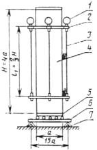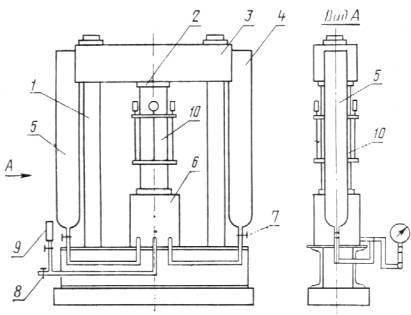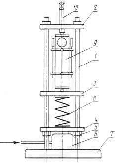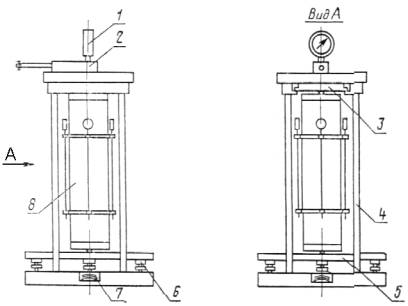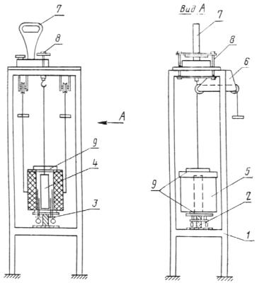 ПРИЛОЖЕНИЕ 1Обязательное МЕТОДЫ ОПРЕДЕЛЕНИЯ ДЕФОРМАЦИЙ ТЕМПЕРАТУРНОЙ УСАДКИ И ПОЛЗУЧЕСТИ БЕТОНА ПРИ НАГРЕВЕ 1. При определении деформаций температурной усадки бетона для каждой температуры нагрева серия должна состоять из шести образцов, из которых три образца подвергают кратковременному нагреву и три образца - длительному нагреву. При определении деформаций ползучести бетона для каждой температуры нагрева серия должна состоять из девяти образцов, из которых три образца нагружают перед нагревом или после нагрева в зависимости от условий испытаний, три образца подвергают длительному нагреву без нагрузки и на трех образцах определяют призменную прочность при температуре нагрева. 2. При проведении испытаний применяют: для определения деформаций температурной усадки - испытательное устройство, схема которого приведена на черт. 1; Схема испытательного устройства для определения деформаций температурной усадки 1 - металлическая рама; 2 - опорный столик; 3 - выносные штанги; 4 ‑ образец; 5 - нагревательное устройство; 6 - система блоков для подъема нагревательного устройства; 7 - весы; 8 - приспособление для подъема и взвешивания образца; 9 - теплоизоляция. Черт. 1 для определения деформаций ползучести при действии повышенных и высоких температур - испытательное устройство, принципиальная схема которого приведена на черт. 2; Схема рычажного устройства для определения деформаций ползучести при нагреве