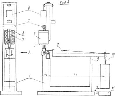 1 - металлическая рама; 2 - неравноплечий рычаг; 3 - опорный столик; 4 - образец; 5 - нагревательное устройство; 6 - приспособление для подъема нагревательного устройства; 7 - силовая балка; 8 ‑ металлические оголовники; 9 - страховочная стойка; 10 - подвеска с грузами; 11 - страховочная опора. Черт. 2 весы циферблатные типа РН-10Ц 13У по ГОСТ 13882-68, нагревательное устройство, а также средства измерения деформаций и температур - по ГОСТ 24452-80. 3. Устройство для испытания бетона на температурную усадку при нагреве должно обеспечивать нагрев образца до требуемой температуры, измерение температуры, деформаций бетона и массы образца в нагретом состоянии. При испытании бетона на температурную усадку в верхнем торце образца просверливают два отверстия на глубину 10-15 мм для установки болтов, за которые подвешивают образец. 4. Испытательное устройство для определения ползучести при нагреве должно обеспечивать нагружение и нагрев образца до требуемой температуры, измерение температуры и деформаций бетона в нагретом состоянии. Основным рабочим органом рычажного испытательного устройства (см. черт. 2) является неравноплечий рычаг 2, имеющий такое очертание, при котором опора реверсивного устройства, промежуточная опора и опора грузовой подвески располагались на одной прямой линии. Все указанные опоры должны быть шарнирными. Конструкция рычага должна обладать повышенной жесткостью и обеспечивать неизменность соотношения его плеч при максимальной нагрузке на грузовой подвеске. Соотношение плеч рычага L2/L1 рекомендуется принимать в пределах 1/10 - 1/15. Длина короткого плеча рычага L2 не должна превышать 25 см. Рычажное устройство должно обеспечивать возможность контроля нагрузки, действующей на образец. Усилие от массы рычага в нерабочем положении испытательного устройства должно восприниматься телескопической страховочной стойкой 9. Расстояние между низом грузовой подвески (10) и страховочной опорой (11) не должно превышать 4 см. 5. Выносные удлинители должны строго фиксировать базу замера деформаций и обеспечивать измерение деформаций бетона в нагретом состоянии с наименьшим температурным изменением их длины. Для этих целей удлинители изготавливают из штапиков кварцевого стекла диаметром 5-10 мм по ТУ 638 КВ или по ТУ-17 РСФСР 71-93-75. При нагреве до 200 °С допускается изготавливать удлинители из железоникелевого сплава Н-36 по ГОСТ 5632-72, диаметром 4-6 мм. 6. Подготовку образцов для измерения деформаций усадки и ползучести при нагреве производят по ГОСТ 24452-80. 7. На каждом удлинителе устанавливают термопару. 8. Нагревание образца производят в возрасте 28 сут, если заданием на испытания не установлен другой срок. Скорость подъема температуры в нагревательном устройстве должна соответствовать указанной в ГОСТ 10180-78. 9. Для определения температурной усадки бетона при кратковременном нагреве образец выдерживают при требуемой температуре 1 ч и потом охлаждают его вместе с печью до температуры воздуха в помещении. Затем образец таким же образом нагревают второй и третий раз. (Измененная редакция. Изм. № 1). Для определения температурной усадки бетона при длительном нагреве образец выдерживают при требуемой температуре не менее 20 сут. Затем образец охлаждают вместе с печью до температуры помещения и потом подвергают его кратковременному нагреву второй и третий раз. 10