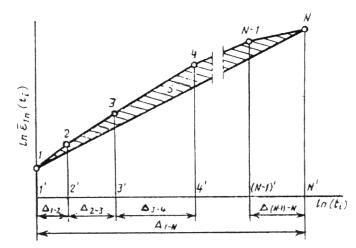 Схема представления результатов измерений для определения площади S Черт. 1 Пример определения ползучести бетона при схеме измерений, отличной от базовой, при наличии аномальных результатов В табл. 1 представлены средние значения относительных деформаций ползучести, полученных в результате испытания серии опытных образцов из подобранного состава бетона. Требуется определить деформацию ползучести бетона к моменту времени ti равному 720 сут. Таблица 1