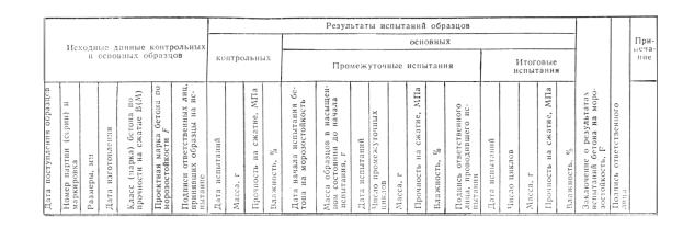 5.4. Влажность бетона определяют по ГОСТ 12730.2 на пробах от контрольных образцов после завершения их водонасыщения и от основных образцов - сразу после их испытания на прочность. Пробы для определения влажности отбирают от трех контрольных и трех основных образцов. 5.5. Марка бетона по морозостойкости соответствует требуемой, если относительное снижение прочности бетона после прохождения числа циклов испытаний, равного требуемому, составит менее 15 %, а средняя потеря массы серии основных образцов не превысит 5 %. 5.6. Марка бетона по морозостойкости не соответствует требуемой, если относительное снижение прочности бетона после прохождения циклов, численно равных требуемой марке, составит более 15 % или средняя потеря массы серии основных образцов бетона превысит 5 %. В этом случае марка бетона по морозостойкости соответствует числу циклов, равному предшествующей марке. 5.7. Марка бетона по морозостойкости не соответствует требуемой, если относительное снижение прочности бетона после прохождения промежуточных циклов испытаний будет более 15 % или средняя потеря массы серии основных образцов более 5 %. 5.8. Исходные данные и результаты испытаний контрольных и основных образцов должны быть занесены в журнал испытаний по форме, приведенной в приложении 4.