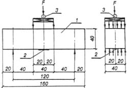 3.1. На образцах выбирают грани, к которым должны быть приложены усилия в процессе нагружения, и растягиваемую поверхность, на которую должен быть наклеен тензорезистор, и отмечают места опирания, передачи усилий и наклейки тензорезисторов согласно схеме нагружения опытного образца, приведенной на черт. 3. Плоскость изгиба образцов при высыхании должна быть перпендикулярна направлению вспучивания бетона при продольной оси образца и параллельна направлению вспучивания, если продольная ось образца параллельна направлению вспучивания бетона.