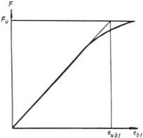 5.1. Модуль упругости определяют для каждого образца по записанной диаграмме "нагрузка - деформация" растянутой поверхности образца ebt следующим образом: к кривой F - ebt проводят касательную в ее начальной точке при F = 0 (черт. 4). Касательная отсекает на линии, соответствующей разрушающей нагрузке Fu, отрезок, длина которого равняется упругой составляющей предельной относительной деформации растяжения eubt; значение модуля упругости Еb рассчитывают по формуле