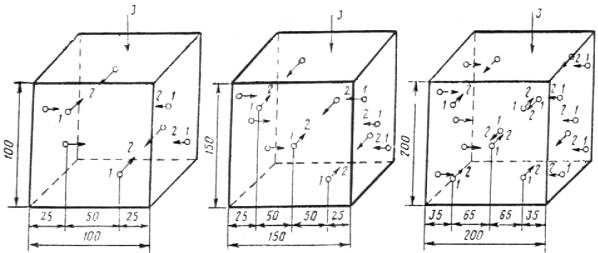 1 - точка ввода ультразвуковых колебаний; 2 - направление прозвучивания; 3 - направление укладки бетонной смеси 4.2. Суммарное время распространения ультразвука t в образце определяют по формуле