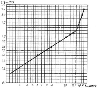 На построенном графике ориентировочно выбирают точку, соответствующую началу резкого увеличения времени распространения ультразвука. Для этой точки (Np - Nm) = 35. Точки, нанесенные на график, разбивают на две группы в соответствии с п. 2 обязательного приложения 4. По точкам каждой группы проводят прямые и определяют точку их пересечения. Образец № 1