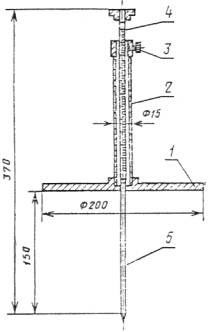 1 - диск; 2 - трубка; 3 - винт; 4 - стержень; 5 - игла 4.1.2. Длину и ширину плит измеряют металлической измерительной рулеткой с миллиметровой шкалой деления в трех местах: посредине плиты и на расстоянии 50 мм от каждого края. Длину и ширину плиты вычисляют как среднее арифметическое значение результатов трех измерений. 4.1.3. Толщину плит измеряют при помощи игольчатого толщиномера с погрешностью 1 мм. Для этого плиту укладывают на ровное твердое основание. Зажимным винтом 3 фиксируют стержень 4 с иглой 5 толщиномера в крайнем нижнем положении (см. черт. 1). Затем прокалывают иглой плиту на всю толщину перпендикулярно основанию, освобождают зажимный винт 3, опускают на поверхность плиты диск 1 с трубкой 2, которые создают удельную нагрузку 500 Па (0,005 кгс/см2). Через 5 мин определяют толщину плиты, по измерительной линейке толщиномера. Толщина плит марок 200, 250 измеряется без пятиминутной выдержки. Толщина измеряется в пяти местах: в углах плиты и в центре. При измерении толщины в углах игла толщиномера должна находиться на расстоянии 150±5 мм от каждого края плиты. Толщину плиты вычисляют как среднее арифметические значение результатов пяти измерений. 4.2. Проверку разности длин диагоналей производят металлической измерительной рулеткой с миллиметровой шкалой деления по ГОСТ 7502-80. 4.3. Разнотолщинность вычисляют как разницу между наибольшим и наименьшим замерами толщины одной плиты, измеренной по п. 4.1.3. 4.4. Однородность структуры - наличие пустот, расслоений, посторонних включений, равномерность, распределения связующего - определяют осмотром среза трех плит. 4.5. Объемную массу плит определяют по ГОСТ 17177-71 со следующими изменениями. Объемную массу определяют на плите, отобранной по п. 3.4, или на образце правильной прямоугольной формы размерами 500х500 мм. Размеры плиты или образца определяют по п. 4.1 и вычисляют объем. Объемную массу вычисляют как среднее арифметическое значение результатов испытания трех плит (или трех образцов, вырезанных из этих плит). 4.6. Теплопроводность плит определяют по ГОСТ 7076-78 и вычисляют как среднее арифметическое значение результатов испытания трех образцов, вырезанных из трех плит. 4.7.1. Сущность метода заключается в определении изменения толщины образца изделия под воздействием сжимающих нагрузок, приложенных в определенной последовательности. 4.7.2. Для проведения испытания применяют прибор, указанный на черт. 2.