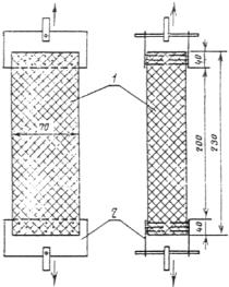1 - образец; 2 - игольчатые зажимы 4.9.3. При испытании образец с обоих концов закрепляют в игольчатых зажимах так, чтобы расстояние между зажимами было 200 мм, помещают в прибор и определяют нагрузку, при которой образец разрывается. Скорость перемещения активного захвата прибора 20 мм/мин. 4.9.4. Предел прочности при растяжении (Rраст) в МПа (кгс/см2) вычисляют по формуле: