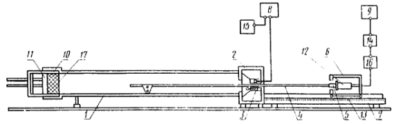 материалов следует находить среднее арифметическое значение величин Ед (Еп) и 3. ОПРЕДЕЛЕНИЕ НОРМАЛЬНОГО КОЭФФИЦИЕНТА ЗВУКОПОГЛОЩЕНИЯ И НОРМАЛЬНОГО ИМПЕДАНСА3.1. Аппаратура 3.1.1. Низкочастотный генератор измерительный 4-го класса, 3-й категории - по нормативно-технической документации. 3.1.2. Электронный вольтметр средних квадратических значений по нормативно-технической документации с диапазоном частот не уже рабочего диапазона частот измерительной системы, основная погрешность - не более ±4 %, входное сопротивление - не менее 1 МОм. 3.1.3. Измерительный микрофон 1-го класса, 1-й группы - по ТУ 25-06.1119-85. 3.1.4. Микрофонный усилитель. Диапазон частот - не уже 20 - 10000 Гц. Неравномерность частотной характеристики в указанном диапазоне частот - не более ± 0,5 дБ относительно 1000 Гц. Коэффициент гармоник в указанном диапазоне частот - не более 0,5 %. Уровень собственного шума и фона, приведенный по входу, - не выше минус 70 дБ относительно 1 мВ. 3.1.5. Громкоговоритель с рабочим диапазоном частот 50 - 8000 Гц. Уровень звукового давления, создаваемый громкоговорителем в точке минимума звукового давления в трубе интерферометра, должен превышать уровень помех не менее чем на 10 дБ. 3.1.6. Акустические фильтры (полосовые) - по ГОСТ 17168-82. 3.1.7. Электронно-счетный частотомер - по ГОСТ 22261-82. 3.1.8. Блок-схема интерферометра приведена на черт. 2. Блок-схема интерферометра 1 - металлическая труба; 2 - коробка; 3 - громкоговоритель; 4 - микрофонный щуп; 5 - резиновая диафрагма; 6 - микрофонная тележка; 7 - направляющая рейка; 8 - низкочастотный генератор; 9 - электронный вольтметр; 10 - обойма; 11 - поршень; 12 - микрофон; 13 - указатель отсчета; 14 - акустический фильтр; 15 - электронно-счетный частотомер; 16 - микрофонный усилитель; 17 - лицевая поверхность образца Черт. 2 Керн магнита громкоговорителя должен иметь отверстие для микрофонного щупа, изготовленного из трубки, наружный диаметр которой составляет 3 мм, а внутренний диаметр 2 мм. Щуп следует соединить с резиновой диафрагмой толщиной 2 мм, укрепленной в центре днища микрофонной тележки, которую передвигают по направляющей рейке. Направляющая рейка должна иметь сантиметровые и миллиметровые деления, позволяющие определять положение переднего отверстия щупа по отношению к лицевой поверхности образца с помощью указателя отсчета в нижней части тележки. На тележке должен быть установлен микрофон, включенный на вход усилителя, соединенного с ламповым вольтметром через акустические (полосовые) фильтры. Для контроля частоты звука, создаваемого генератором, параллельно его выходу следует включить электронно-счетный частотомер. Размеры труб интерферометра в зависимости от требуемого частотного диапазона измерений следует принимать по табл. 3. В трубе интерферометра длиной 7 м вместо щупа следует помещать микрофон. При этом на поверхности трубы должно быть установлено устройство с отсчетным приспособлением, позволяющим определять положение микрофона относительно лицевой поверхности образца. 3.2. Условия проведения испытаний 3.2.1. Для проведения испытаний необходимо отбирать звукопоглощающие материалы и изделия, отвечающие внешнему виду, размерам и физико-механическим показателям требований стандартов или технических условий на эти материалы и изделия. 3.2.2. Из отобранных материалов и изделий следует вырезать пуансоном три образца в виде цилин