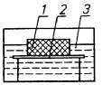 1 — сетчатый пригруз; 2 — образец; 3 — сетчатая подставка; 4 — ванна Рисунок 4 — Ванна с образцом, полностью погруженным в воду 10.3.2 Порядок подготовки к испытанию Для испытания из изделия вырезают образец в форме прямоугольного параллелепипеда длиной и шириной (100 ± 2) мм и толщиной, равной толщине изделия. Из органических ячеистых изделий вырезают образец размером [(50 х 50 х 50) ± 1] мм. При толщине изделий меньше 50 мм высоту образца принимают равной толщине изделия. Образцы высушивают до постоянной массы в соответствии с разделом 3 и охлаждают в эксикаторе над хлористым кальцием. 10.3.3 Порядок проведения испытания В ванну 4 (рисунок 4) на сетчатую подставку 3 помещают образец 2 и фиксируют его положение сетчатым пригрузом 7. Затем заливают в ванну воду температурой (22 ± 5) °С так, чтобы уровень воды был выше пригруза на 20 — 40 мм. Через 24 ч после залива воды образец переносят на подставку и через 30 с взвешивают на сухом поддоне. Массу воды, вытекшей из образца во время взвешивания в поддон, включают в массу насыщенного водой образца. Образцы из органических ячеистых изделий через 24 ч после залива воды вынимают, протирают фильтровальной бумагой и взвешивают. 10.4 Метод определения водопоглощения при частичном погружении образца в воду 10.4.1 Сущность метода заключается в измерении массы воды, впитанной образцом сухого материала, частично погруженным в воду, в течение заданного времени. 10.4.2 Для испытания вырезают образец по форме прямоугольного параллелепипеда длиной и шириной (100 ± 2) мм и толщиной (30 ± 2) мм. Если толщина изделия больше 30 мм, то излишек срезают с одной стороны. Образец высушивают до постоянной массы, затем охлаждают в эксикаторе над хлористым кальцием и взвешивают. 10.4.3 В ванну 3 (рисунок 5) на сетчатую подставку 2 помещают несрезанной плоскостью образец 1.