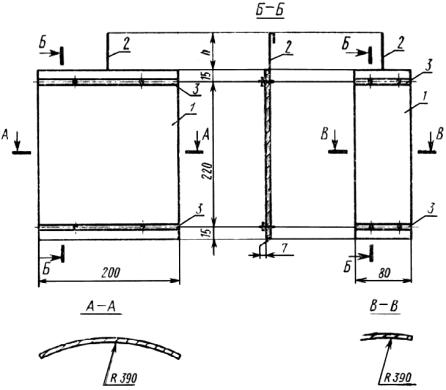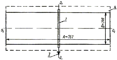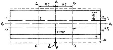 Черт. 1 Схема расположения в рабочей камере АИП двух угольных дуговых ламп и зоны облучения 1 - трубчатая ксеноновая лампа; 2, 2¢ - центры угольных дуговых ламп (дуги); 3 - крестовина вала барабана; 4 - экспозиционный барабан; А - расстояние между противолежащими образцами, расположенными в вертикальных кассетах; В - высота зоны облучения; О1О1 - вертикальная ось симметрии зоны облучения; О2О2 - горизонтальная ось симметрии зоны облучения; С1С1 и С2С2 - оси первого и второго источников облучения; F1F1 и F2F2 - линии центров угольных дуговых ламп. Черт. 2 2.6. Устройство для дождевания образцов 2.6.1. Устройство должно обеспечивать дождевание водой облучаемой поверхности образцов в течение заданного промежутка времени. Вода, выходящая из сопел, не должна попадать на образец в виде струи. 2.6.2. Дистиллированная вода, применяемая для дождевания и замачивания образцов, должна удовлетворять требованиям ГОСТ 6709-72. 2.7. Температурный режим в рабочей камере аппарата искусственной погоды следует обеспечивать приточно-вытяжной вентиляцией и орошением наружной (нерабочей) поверхности экспозиционного барабана. 2.8. Для обеспечения заданных режимов испытаний могут применяться установки любого типа. 3. ПОДГОТОВКА К ИСПЫТАНИЮ3.1. Подготовка образцов 3.1.1. До проведения испытания образцы должны быть выдержаны не менее 24 ч при температуре 20±2 °С. 3.1.2. Перед испытанием образцов в аппарате искусственной погоды должны быть определены и записаны в рабочий журнал физико-механические показатели испытуемого кровельного материала, по которым будет определяться стойкость материала на старение. 3.1.3. Образцы размерами 190´230 и 70´230 мм должны быть укреплены на металлические кассеты, размеры которых соответственно 200´240 и 80´240 мм (черт. 3). Между образцами и кассетой прокладывают целлофановую пленку. Образцы крепят к кассетам при помощи металлической пластинки. Кассеты должны иметь подвески (скобы) для установки их в барабане аппарата. 3.1.4. Образцы должны быть маркированы. Маркировку образцов производят по поверхности металлической пластинки. 3.1.5. Образцы в течение всего периода испытания по режиму, указанному в пп. 4.1.1 и 4.1.2, должны быть закреплены на кассете. 3.2. Подготовка аппаратуры 3.2.1. До начала испытаний образцов аппаратура должна быть отрегулирована на заданный режим по пп. 4.1.1 и 4.1.2. 3.2.2. Замена ксеноновой лампы и колпаков угольных дуговых ламп должна производиться по истечении гарантийного срока службы, указанного в паспортах. 3.2.3. Стеклянный колпак угольной дуговой лампы при смене углей должен быть вымыт теплой водой с мылом и вытерт насухо мягкой хлопчатобумажной тканью. 3.2.4. При установке стеклянного колпака угольной дуговой лампы должно быть обеспечено плотное присоединение его к корпусу лампы. Для этого между металлическим корпусом лампы и стеклянным колпаком устанавливают тонкую асбестовую прокладку. Плотный прижим колпака к асбестовой прокладке достигается регулировкой пружинного держателя. 1 - кассета, изогнутая по кривизне барабана; 2 - подвеска кассеты; 3 - пластинка для крепления образца; h - высота подвески в соответствии с размерами зоны облучения. Черт. 3 3.2.5. Для контроля температуры в АИП используют термометр с «черной панелью». 3.2.6. Определение фактической и условной температур образца в процессе испытания его в АИП производят следующим образом. При экспон