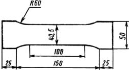4.4. Для определения прочности и относительного удлинения при разрыве из образцов размерами 190´230 мм, прошедших определенное количество циклов испытаний, вырубаются при помощи штанцевого ножа три образца в форме двусторонней лопатки (черт. 4). Образцы испытывают на разрыв со скоростью 30 мм/мин. 4.5. Для определения прочности и относительного удлинения при разрыве применяют разрывные машины с постоянной скоростью перемещения нижнего захвата (с маятниковым силоизмерителем) или машины с постоянной скоростью растяжения образца (с малоинерционным силоизмерителем). Черт. 4 5. ОБРАБОТКА РЕЗУЛЬТАТОВ ИСПЫТАНИЯ5.1. Определение стойкости к старению по изменению физико-механических показателей рулонного кровельного материала 5.1.2. За величину прочности при разрыве (R) и удлинения (D`l) принимают среднее арифметическое значение результатов испытаний образцов-лопаток, определяемых по формулам