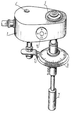 где Р - нагрузка по показанию разрывной машины, при которой происходит отрыв линолеума от бетонной плитки, Н (кгс); S - площадь склеивания линолеума с бетонной плиткой, см2 4.6. Определение вязкости Вязкость мастики определяют через 2 ч после изготовления. Вязкость мастики определяют как отношение напряжения сдвига на поверхности вращающегося в мастике цилиндра-деформатора к скорости сдвига на его поверхности. 4.6.1. Аппаратура Ротационный портативный экспресс-вискозиметр ЭВ-3 с погрешностями измерений, не превышающими ±7 %, в комплекте с тремя цилиндрами-деформаторами диаметром 5,15 и 45 мм. Сосуд для мастик диаметром 130 и высотой 120 мм. Вискозиметр ЭВ-3 схематически изображен на черт. 2. Черт. 2 Ротационный экспресс-вискозиметр ЭВ-3 состоит из следующих частей: корпуса прибора 1; переключателя скорости вращения цилиндра-деформатора 2; пружинного привода с ключом завода 3; кнопки пуска и остановки прибора 4; тормоза 5, включаемого и выключаемого одновременно с пуском и остановкой прибора; узла измерителя моментов сопротивления 6, состоящего из верхнего диска со шкалой и нижнего - со стрелкой-указателем, спиральной пружины между ними и механизма определения числа поворотов дисков; цилиндра-деформатора 7. 4.6.2. Подготовка к испытанию В узле измерителя моментов сопротивления 6 закрепляют цилиндр-деформатор диаметром 45 мм (при повышенной вязкости следует использовать цилиндр диаметром 15 мм). Поворотом переключателя 2 устанавливают скорость вращения цилиндра-деформатора 40 об/мин и ключом полностью заводят привод. Стрелку-указатель нижнего диска узла измерителя моментов сопротивления устанавливают против нуля шкалы верхнего диска. Уровень исследуемой мастики должен быть на расстоянии не более 20 мм от верхней кромки сосуда. Перед измерением мастику тщательно перемешивают. 4.6.3. Проведение испытания При испытаниях необходимо выдерживать вертикальность оси цилиндра-деформатора. Зазор между цилиндром-деформатором, стенками и дном сосуда должен быть не менее 40 мм. Цилиндр-деформатор вискозиметра погружают в мастику на 1-2 мм ниже верхней его кромки. Нажатием на кнопку 4 включают вискозиметр. При вращении цилиндра-деформатора за счет вязкости мастики происходит смещение нижнего диска по отношению к верхнему. После 4 оборотов цилиндра-деформатора резко отпускают кнопку 4 для остановки прибора и снимают показание со шкалы верхнего диска измерителя моментов. 4.6.4. Обработка результатов По показаниям прибора с помощью монограммы (прилагаемой к прибору) в зависимости от диаметра цилиндра-деформатора и скорости его вращения определяют вязкость в паузах с точностью до 1 Пз. Расхождение между параллельными измерениями не должно быть более 5 %. За результат испытаний принимают среднее арифметическое значение трех параллельных измерений. 4.7. Вязкость мастик на вискозиметре типа ВЗ-246, диаметр сопла 6,0 мм, определяют по ГОСТ 8420-74, при этом мастику разбавляют растворителем в соотношении по массе 4:1 (мастика : растворитель). В качестве растворителя применяется смесь бензин : этилацетат в соотношении 1:1. 4.8. Определение содержания летучих компонентов Сущность метода заключается в нагревании навески мастики при заданной температуре до постоянной массы. Содержание летучих компонентов определяют по ГОСТ 17537-72, при этом мастику массой около 1 г наносят на пласт