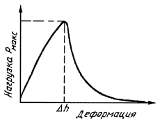 скоростью движения подвижного захвата разрывной машины 10 2.4.3. Максимальную нагрузку при растяжении и удлинение образца материала при максимальной нагрузке определяют по диаграмме "нагрузка-деформация". Масштаб записи выбирают так, чтобы форма диаграммы была аналогична приведенной на черт. 1. Масштаб записи должен быть указан в нормативно-технической документации на материал. 2.4.4. Для определения характера разрушения образца обе подложки освобождают от захватов, срезают основную массу герметизирующего материала ножом, смоченным водой, так, чтобы на поверхности подложки оставался слой герметизирующего материала толщиной (1±0,5) мм. На место отрыва материала от поверхности подложки накладывают трафарет таким образом, чтобы число клеток, под которыми отсутствует герметизирующий материал, было минимальным. Затем подсчитывают площадь отрыва, т.е. число клеток, под которыми отсутствует герметизирующий материал. Любое отслоение материала в площади клетки, наблюдаемое невооруженным глазом, считают адгезионным отрывом. 2.5. Обработка результатов 2.5.1. Предел прочности при растяжении (Rp) в мегапаскалях вычисляют по формуле