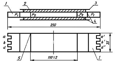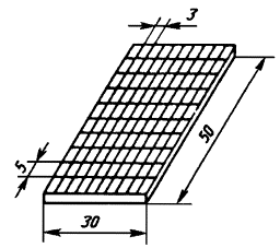 захвата 10 запись диаграммы "нагрузка-деформация" (черт. 1) в масштабе 1:1, 5:1, 10:1; погрешность записи деформации не должна превышать ±3 % действительной деформации. Черт. 1 Стальные захваты, схема которых приведена на черт. 2. Допускается изменение конструкции зажимов в соответствии с типом разрывной машины. Черт. 2 Металлическая линейка по ГОСТ 427-75. Сушильный электрошкаф, обеспечивающий поддержание температуры в диапазоне 50-100 °С. Трафарет, изготовленный из прозрачного органического стекла по ГОСТ 17622-72 или оконного стекла по ГОСТ 111-78 (черт. 3). Толщина стекла должна быть 1-2 мм. Длина трафарета должна быть 49,8+0,2 мм, ширина 29,8+0,2 мм. Разметку сетки на стекле производят механическим или химическим способом (травлением). Подложка в виде призмы длиной и шириной 50+2 мм и толщиной, обеспечивающей сохранение формы подложки в процессе изготовления и испытания образца. Материал подложки должен быть указан в нормативно-технической документации на конкретный герметизирующий материал. Масса подложки не должна превышать 170 г. Черт. 3 Деревянные ограничительные планки длиной 52+1 мм, шириной 20±0,5 мм и толщиной 10±1 мм. Минеральное масло по ГОСТ 20799-75. Антиадгезионная бумага. Мел по ГОСТ 12085-73 или другие виды наполнителей по нормативно-технической документации. 2.3.1. Подготовка подложки к нанесению герметизирующего материала должна осуществляться в соответствии с нормативно-технической документацией на конкретный герметизирующий материал. 2.3.2. Отобранной пробе материала придают форму цилиндра диаметром 30-35 мм и длиной не менее 50 мм. 2.3.3. При необходимости подогрева пробу перед изготовлением образцов помещают на антиадгезионную бумагу и выдерживают при температуре, указанной в нормативно-технической документации на испытываемый герметизирующий материал, в течение 1 ч. Пробу, подготовленную по п. 2.3.2, помещают на середину подложки и обжимают с двух сторон деревянными ограничительными планками. Во избежание прилипания пробы материала к деревянным планкам они должны быть смазаны минеральным маслом и присыпаны наполнителем, применяемым для изготовления этого материала. Сверху пробу прижимают второй подложкой до соприкосновения с ограничительными планками для придания ей прямоугольной формы шириной 30+1 мм, высотой (20±0,5) мм и длиной 50+2 мм. Избыток герметизирующего материала удаляют ножом со сторон, неограниченных планками. Допускается использование других антиадгезионных покрытий, исключающих налипание герметизирующего материала к планкам. 2.4. Проведение испытания 2.4.1. После выдержки образца в условиях, указанных в п. 2.3.4, не удаляя ограничительные планки, замеряют его ширину и длину (за длину образца принимают длину наименьшей из подложек). Затем вынимают ограничительные планки и помещают образец в захваты разрывной машины. Время от изъятия планок до начала деформирования должно составлять не более 30 с. 2.4.2. Испытания проводят со