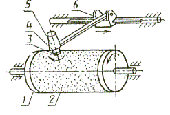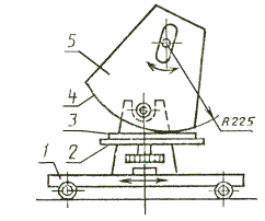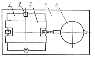 Результат округляют до 1 мкм. (Измененная редакция, Изм. № 1). 3.2. Метод определения истираемости на машине с возвратно-поступательным движением Метод предназначается для определения истираемости (износостойкости) при разработке и освоении новых видов поливинилхлоридных материалов для полов. Сущность метода заключается в определении величины уменьшения толщины материала при истирании в течение заданного количества циклов испытания или в определении количества циклов испытания истирания слоя износа на всю его толщину. 3.2.1. Отбор образцов Размеры и форма образца должны быть указаны в нормативно-технической документации на машину. 3.2.2. Аппаратура и приспособления Машина с возвратно-поступательным движением, схема которой указана на черт. 3. 1 - площадка; 2 - стол; 3 - образец; 4 - шлифовальная шкурка; 5 - рабочий элемент Черт. 3 Конструкция машины должна обеспечивать: - наличие рабочего элемента с цилиндрической поверхностью радиусом (225,0 ± 0,5) мм, массой (17,0 ± 0,2) кг и шириной основания (140,0 ± 1,0) мм, обтянутого шлифовальной шкуркой шириной (106,0 ± 1,0) мм; - движение площадки со скоростью 40 возвратно-поступательных ходов в минуту с амплитудой хода (106,0 ± 1,0) мм; - поворот стола на (36 ± 2)° и перекатывание рабочего элемента по поверхности образца в каждом направлении со скольжением (36,0 ± 0,5) мм относительно амплитуды хода. Шкурка шлифовальная тканевая (15-13)А8-П по ГОСТ 5009-82. Весы лабораторные общего назначения 4-го класса точности с наибольшим пределом взвешивания до 500 г по ГОСТ 24104-88. Кисть или щетка для сметания пыли. (Измененная редакция, Изм. № 1). 3.2.3. Подготовка к испытанию 3.2.3.1. Определяют плотность слоя износа материала в соответствии с приложением 1. 3.2.3.2. Определяют коэффициент истирающей способности шкурки K в соответствии с приложением 2. 3.2.3.3. Образец взвешивают. 3.2.4. Проведение испытания 3.2.4.1. Образец закрепляют в машину по способу, указанному в нормативно-технической документации на машину. Рабочий элемент опускают на образец и включают электродвигатель. Истирание образца начинают по неистертому участку поверхности шлифовальной шкурки. Количество циклов, через которое производят смену шкурки перемещением ее на длину истертого участка, должно быть указано в нормативно-технической документации на материал конкретного вида. Поверхности образца очищают кистью или щеткой через то же количество циклов. При определении истираемости на всю толщину слоя износа по количеству циклов испытания визуально проверяют истертость поверхности. Если образец истерт на всю толщину слоя износа в пяти и более местах, испытание прекращают. 3.2.4.2. При определении истираемости (износостойкости) по уменьшению толщины количество циклов испытания должно быть указано в нормативно-технической документации на материал конкретного вида. 3.2.4.3. По окончании испытания образец вынимают из машины, очищают кистью или щеткой от продуктов износа и взвешивают. 3.2.5. Обработка результатов 3.2.5.1. Истираемость (износостойкость) материала по уменьшению толщины рассчитывают так же, как указано в п. 3.1.5. 3.2.5.2. Истираемость (износостойкость) материала по количеству циклов испытания С рассчитывают по формуле