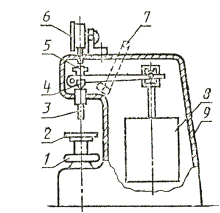 где Сф - фактическое количеству циклов испытания до истирания образца в пяти и более местах на всю толщину слоя износа; K - коэффициент истирающей способности шлифовальной шкурки, определяемый в соответствии с приложением 2. Результат округляют до 1 мкм. (Измененная редакция, Изм. № 1). 4. ОПРЕДЕЛЕНИЯ ДЕФОРМАТИВНОСТИ ПРИ ВДАВЛИВАНИИСущность метода заключается в определении величин абсолютной деформации при вдавливании индентора под нагрузкой, абсолютной остаточной деформации после снятия нагрузки и восстанавливаемости. Метод не распространяется на полимерные материалы толщиной менее 1,2 мм. 4.1. Испытание проводят на трех образцах размером [(50´50) ± 5] мм. (Новая редакция, Изм. № 1). 4.2. Аппаратура 4.2.1. Устройство для испытания, принципиальная схема, которого указана на черт. 4. 4.2.1.1. Конструкция устройства для испытания должна обеспечивать: - предварительную нагрузку, равную 10 Н, для обеспечения контакта индентора с поверхностью испытуемого образца при установке стрелки отсчетного устройства в нулевое положение и при отсчете абсолютной остаточной деформации; - плавное приложение основной нагрузки, равной (1000 ± 10) Н; - постоянство воздействия основной нагрузки и течение времени, необходимого для испытания; - вертикальный ход индентора не менее 4 мм или не менее 2 мм при испытании материала толщиной до 2 мм; - измерение деформации от 0 до 4 мм с погрешностью не более ±0,01 мм. 4.2.1.2. Индентор и подъемный столик должны удовлетворять следующим требованиям; - индентор должен быть самоустанавливающимся, цилиндрической формы с плоским основанием, диаметр (11,3 ± 0,1) мм, края основания индентора должны быть закруглены по радиусу (0,15 ± 0,02) мм; ПРИНЦИПИАЛЬНАЯ СХЕМА УСТРОЙСТВА ДЛЯ ИСПЫТАНИЯ 1 - гайка-маховик; 2 - подъемный столик; 3 - индентор; 4 - призма рычага основной нагрузки; 5 - шпиндель с грузом предварительной нагрузки; 6 - отсчетное устройство; 7 - рукоятка приложения и снятия основной нагрузки; 8 -грузы для основной нагрузки; 9 - корпус Черт. 4 - подъемный столик, регулируемый по высоте, должен быть толщиной не менее 10 мм; - рабочие поверхности индентора и подъемного столика должны иметь твердость не менее 61 НRСэ и шероховатость Ra, равную 0,63 мкм, по ГОСТ 2789-73. (Измененная редакция, Изм. № 1). 4.2.1.3. Приложение основной нагрузки другой величины и применение индентора другой формы и размера должны быть указаны в нормативно-технической документации на материал конкретного вида. 4.2.2. Секундомер. Проверяют величину деформации корпуса устройства для испытания в соответствии с приложением 3. Проверку проводят не реже одного раза в сутки. 4.4. Проведение испытания 4.4.1. Образец укладывают на подъемный столик устройства для испытания лицевой поверхностью вверх так, чтобы индентор находился в центре образца. При наличии у материала подосновы образцы испытывают вместе с ней. 4.4.2. Подъемный столик с образцом приводят в соприкосновение с индентором. Устанавливают указатель отсчетного устройства в нулевое положение или положение, указанное в паспорте прибора, при этом на испытуемый образец начинает действовать предварительная нагрузка. Затем плавно в течение (4 ± 1) с прикладывают основную нагрузку. Рекомендации по установке стрелки отсчетного устройства в нулевое положение приведены в приложении 3. 4.4.3. Значение абсолютной деформации определяют по отсчетному устройству посл