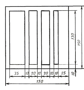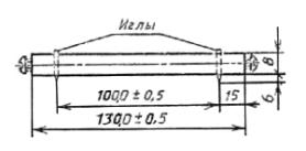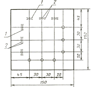 где ha - абсолютная деформация, мм; hо - абсолютная остаточная деформация, мм. Результат округляют до 1 %. (Измененная редакция, Изм. № 1). 4.5.3. Результаты испытания образцов, у которых в процессе приложения нагрузки образуются трещины или наблюдается разрушение от продавливания, в расчет не принимают. 4.5.4. За результат испытаний принимают среднее арифметическое значение параллельных определений показателей: - абсолютной деформации результат округляют до 1 мм; - абсолютной остаточной деформации результат округляют до 1 мм; - восстанавливаемости результат округляют до 1 %. (Измененная редакция, Изм. № 1). 5. ОПРЕДЕЛЕНИЕ ИЗМЕНЕНИЯ ЛИНЕЙНЫХ РАЗМЕРОВ5.1. Метод определения изменения линейных размеров по рискам Сущность метода заключается в измерении расстояния между рисками, нанесенными на образец до и после воздействия на него заданной температуры в течение заданного времени. 5.1.1. Отбор образцов Испытание проводят на трех образцах размером [(150´150) ± 2] мм. (Новая редакция, Изм. № 1). 5.1.2. Аппаратура и приспособления Электрический сушильный шкаф, обеспечивающий и поддерживающий температуру (70 ± 2) °С. Оптическое устройство, снабженное измерительной шкалой с ценой деления не более 0,1 мм. Разметочный шаблон, состоящий из металлического стержня и двух игл, установленных на расстоянии (100,0 ± 0,5) мм друг от друга. Радиус острия иглы должен быть не более 0,05 мм. Схема разметочного шаблона указана на черт. 5. Черт. 5 Приспособление для разметки образца размерами 150´150´2 мм, схема которого указана на черт. 6. (Измененная редакция, Изм. № 1). Образец кладут на горизонтальную поверхность лицевой стороной вверх и при помощи приспособления для разметки наносят по четыре линии в продольном и поперечном направлениях. Из крайних точек пересечения продольных и поперечных линий разметочным шаблоном наносят риски, как указано на черт. 7. 5.1.4. Проведение испытания 5.1.4.1. Размеченные образцы помещают в сушильный шкаф, нагретый до температуры (70 ± 2) °С на 5 ч. При изменении режима испытания он должен быть указан в нормативно-технической документации па материал конкретного вида. Черт. 6 Черт. 7 5.1.4.2. После термостатирования образец выдерживают 30 мин. (Измененная редакция, Изм. № 1). 5.1.4.3. Из тех же точек, на те же линии, как в п. 5.1.3, разметочным шаблоном вновь наносят риски. 5.1.4.4. Расстояние между центрами двух рисок измеряют при помощи оптического устройства. 5.1.5. Обработка результатов 5.1.5.1. Величину изменения линейных размеров Х в процентах вычисляют по формуле