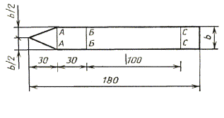 где l1 - показание индикатора при обмере образца до термостатирования, мм; l2 - показание индикатора при обмере образца после термостатирования, мм; l - величина стороны образца, равная 100 мм. 5.2.5.2. За результат испытаний принимают среднее арифметическое значение параллельных определений показателя изменения линейных размеров в продольном и поперечном направлениях (в каждом направлении отдельно). Результат округляют до 0,1 %. (Измененная редакция, Изм. № 1). 6. ОПРЕДЕЛЕНИЕ ПРОЧНОСТИ СВЯЗИ МЕЖДУ СЛОЯМИСущность метода заключается в определении прочности связи между лицевым слоем из прозрачной пленки с печатным рисунком и полимерным слоем или полимерным слоем и подосновой по силе, необходимой для отделения одного слоя от другого при заданной ширине образца. 6.1. Отбор образцов Для определения прочности связи между слоями (в продольном и поперечном направлениях) из отобранного материала вырезают по три образца длиной (180 ± 1) мм. Форма образца указана на черт. 9. Ширина образца для определения прочности связи между лицевым слоем из прозрачной пленки с печатным рисунком и полимерным слоем - (15 ± 1) мм; ширина образца для определения прочности связи между полимерным слоем и подосновой - (70 ± 1) мм, если в нормативных документах на конкретный вид материала не указана другая ширина образца. (Измененная редакция, Изм. № 1). Черт. 9 6.2. Аппаратура и приспособления Разрывная машина с безынерционным или маятниковым силоизмерителем. Конструкция машины должна обеспечивать: - передвижение подвижного зажима со скоростью (100 ± 10) мм/мин; - измерение силы инерционным силоизмерителем с погрешностью не более ±1 % от измеряемой величины; - величину измеряемой силы маятниковым силоизмерителем в пределах 20 - 85 % предельного значения шкалы. Машина может быть снабжена самопишущим устройством для записи диаграммы «сила-длина участка расслоения». Линейка измерительная металлическая с пределом измерения 300 или 500 мм по ГОСТ 427-75. Этилацетат по ГОСТ 8981-78. Нож. Стеклянный или фарфоровый сосуд диаметром не более 60 мм и высотой не более 100 мм. Бумага фильтровальная лабораторная по ГОСТ 12026-76. 6.3. Подготовка к испытанию 6.3.1. На лицевой и тыльной сторонах образца наносят по три параллельные линии А-А, Б-Б и С-С, как указано на черт. 9. 6.3.2. Образец расслаивают вручную или при помощи ножа до линии А-А. Затем образец расслаивают вручную или при помощи машины до линии Б-Б. 6.3.3. Образцы, не поддающиеся расслаиванию вручную, опускают в сосуд с этилацетатом до линии А-А. Уровень этилацетата в сосуде должен быть не более 20 мм. Сосуд с образцом ставят в вытяжной шкаф на (20 ± 2) мин. Затем образец вынимают из сосуда, промокают фильтровальной бумагой досуха и расслаивают образец вручную до линии Б-Б. Расслоенный образец вновь помещают в вытяжной шкаф до испарения этилацетата, но не менее чем на 1 ч. 6.3.4. Образец, не поддающийся расслоению указанными способами, считают прошедшим испытание. 6.4. Проведение испытания 6.4.1. Образец закрепляют в зажимах машины до линии Б-Б, при этом отслаиваемый слой закрепляют в подвижном зажиме. Образец расслаивают на длину участка (100 ± 1) мм. 6.4.2. В процессе испытания записывают по шкале силоизмерителя не менее трех максимальных и трех минимальных показателей силы. 6.4.3. При испытании на машине с самопишущим устройством снимают диаграмму «сила - длина участка расслоения». 6.4.4. 