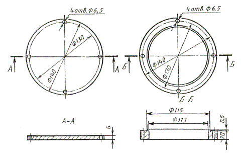где m1 - масса образца до водопоглощения, г; m2 - масса образца после водопоглощения, г. Результат округляют до 0,1 %. (Измененная редакция, Изм. № 1). 7.1.5.2. (Исключен, Изм. № 1). 7.2. Метод определения водопоглощения по поверхности Сущность метода заключается в определении массы воды, поглощенной лицевой поверхностью образца материала в течение заданного времени. 7.2.1. Отбор образцов Испытание проводят на трех образцах размером [(125´125) ± 1] мм. (Новая редакция, Изм. № 1). 7.2.2. Аппаратура, материалы Весы лабораторные общего назначения 2, 3, 4-го классов точности с наибольшим пределом взвешивания до 500 г по ГОСТ 24104-88. Разборная форма из нержавеющего металла, конструкция которой указана на черт. 10. Детали формы для определения поверхностного водопоглощения Поддон Кольцо Примечание. Для скрепления деталей формы применяют болты М6´25. Черт. 10 Бумага фильтровальная лабораторная по ГОСТ 12026-76. Вода питьевая по ГОСТ 2874-82. Сосуд вместимостью не менее 0,2 л из стекла, фарфора, фаянса или эмалированноё стали. Часы любого типа. (Измененная редакция, Изм. № 1). 7.2.3. Подготовка к испытанию В сосуд наливают воду и выдерживают не менее 1 ч. (Измененная редакция, Изм. № 1). 7.2.4. Проведение испытания 7.2.4.1. Вырезанные образцы взвешивают каждый отдельно. 7.2.4.2. Взвешенный образец укладывают на поддон формы лицевой стороной вверх, на образец устанавливают кольцо, которое для устранения утечки воды прижимают к образцу болтами. 7.2.4.3. В собранную форму с образцом наливают из сосуда воду на высоту (10 ± 1) мм. 7.2.4.4. Через (24,0 ± 0,5) ч воду из формы выливают. (Измененная редакция, Изм. № 1). 7.2.4.5. Внутренние поверхности формы и образец промокают фильтровальной бумагой. 7.2.4.6. Форму разбирают, вынимают образец и промокают фильтровальной бумагой его лицевую поверхность до тех пор, пока на ней не перестанут появляться следы влаги. 7.2.4.7. Образец взвешивают. 7.2.5. Обработка результатов испытания 7.2.5.1. Водопоглощение по поверхности WS, г/см2, вычисляют по формуле