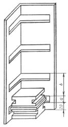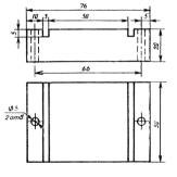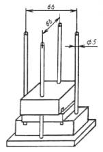 а = (9+h) мм; b = (41+h) мм; h - толщина образца, мм для колодок типа Б - из плоского основания с закрепленными перпендикулярно к нему четырьмя металлическими стержнями, которые продевают в сквозные отверстия колодок (черт. 4).