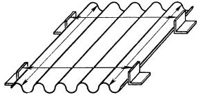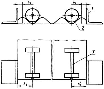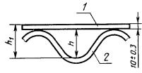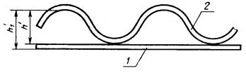 штангенглубиномером с использованием металлической накладки (черт. 3), где 1 - накладка; 2 - лист Накладку помещают на два соседних гребня волн, кроме крайних (перекрывающей и перекрываемой), и штангенциркулем путем выдвижения линейки для измерения глубины или штангенглубиномером измеряют расстояние от низшей точки впадины волны до верхней грани накладки (h1). Измерение высоты каждой волны производят два раза - по одному у каждого из торцов на расстоянии 50 - 100 мм от кромки. За высоту рядовой волны h принимают разность между средним арифметическим значением результатов двух измерений и толщиной накладки. При измерении высоты перекрывающей (перекрываемой) волны используют те же средства контроля, что и при измерении высоты рядовой волны. Изделие сдвигают в продольном направлении за край стола. Снизу к нему прижимают накладку в соответствии с черт. 5, штангенциркулем путем выдвижения линейки для измерения глубины или штангенглубиномером измеряют расстояние от нижней грани накладки до высшей точки нелицевой поверхности изделия (h¢1). Измерение высоты перекрывающей (перекрываемой) волны производят два раза - по одному у каждого из торцов изделия. За высоту перекрывающей (перекрываемой) волны h¢ принимают разность между средним арифметическим значением двух измерений и толщиной накладки. 1 - накладка; 2 - лист Допускается при определении высоты волны применять вместо накладки линейку, которую при измерении следует прикладывать ребром к поверхности изделия. В этом случае из среднего арифметического значения результатов двух измерений вычитают ширину линейки. 3.2.5. Измерение перекрывающей (перекрываемой) кромки Измерение производят линейкой с использованием упора и металлического цилиндра (черт. 6). Схема измерения - в соответствии с черт. 7. * Размер для справок К измеряемой кромке приставляют упор, в ближайшую к ней впадину волны кладут цилиндр. В направлении торцевой кромки листа измеряют расстояние от острия цилиндра до упора (b¢1 или b¢2). Измерения производят два раза, по одному у каждого из торцов изделия. За размер измеряемой кромки (b1 или b2) принимают разность между средним арифметическим значением результатов двух измерений и половиной шага волны, указанного в нормативно-технической документации на конкретное изделие. 3.2.6. Отклонение от прямолинейности измеряют линейкой или щупом, используя в качестве прямолинейной базы ребро металлической линейки длиной 1 м. При контроле линейку длиной 1 м последовательно прикладывают ребром к кромке изделия по всей длине и измеряют наибольший зазор между ребром линейки и кромкой изделия. За отклонение от прямолинейности листа принимают наибольшее из измеренных значений. 1 - упор; 2 - лист; 3 - цилиндр 3.2.7. Отклонение от прямоугольности измеряют линейкой или щупом, используя в качестве прямоугольной базы металлический угольник, длина одной стороны которого равна 1 м, а другой - не менее 0,5 м. Угольник последовательно прикладывают ко всем углам изделия так, чтобы короткая сторона его плотно прилегала к кромке изделия, и измеряют максимальный зазор между стороной угольника длиной 1 м и кромкой изделия. При необходимости допускается зачистка кромок. За отклонение от прямоугольности листа принимают наибольшее из измеренных значений. 3.2.8. Отклонение от плоскостности измеряют линейкой или щупом, 