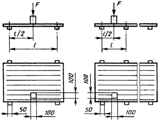 где F - разрушающая нагрузка, Н (кгс); l - расстояние между осями опор, м (см); b - ширина образца, м (см); t - толщина образца, м (см); 10-6 - коэффициент пересчета Па в МПа. Результат вычисления округляют до 0,1 МПа (1 кгс/см2). За предел прочности при изгибе плоского листа принимают среднее арифметическое значение результатов испытаний двух образцов, вырезанных из данного листа. Предел прочности при изгибе (si) полномерных волнистых листов, испытанных по черт. 12, вычисляют в мегапаскалях (килограммах силы на квадратный сантиметр) по формуле где F - разрушающая нагрузка, Н (кгс); l - расстояние между осями опор, м (см); 10-6 - коэффициент пересчета Па в МПа. W - момент сопротивления сечения листа, м3 (см3), вычисляемый по формуле где h - высота волны, м (см); t - толщина листа, м (см); b1 = 0,25(S + 2,6t); b2 = 0,25(S - 2,6t), где S - шаг волны (номинальный размер по стандарту на конкретное изделие), м (см); h1 = 0,5(h + t); h2 = 0,5(h - t); K - коэффициент, учитывающий число волн, работающих на изгиб, вычисляемый по формуле где B - ширина листа, мм; S - шаг волны (номинальный размер по стандарту на конкретное изделие), мм. Результат вычисления округляют до 0,1 МПа (1 кгс/см2). За предел прочности при изгибе асбестоцементных изделий партии принимают среднее арифметическое значение результатов испытаний всех образцов партии. 5. Определение несущей способности волнистых листов5.1. Сущность метода заключается в разрушении волнистого листа нагрузкой, прикладываемой посередине пролета по однопролетной схеме. 5.2. Подготовка образцов Листы перед испытанием выдерживают в течение 24 ч в помещении лаборатории или цеха. 5.3. Средства контроля Устройство любой конструкции, обеспечивающее возможность приложения нагрузки по заданной схеме со скоростью нарастания нагрузки не более 200 Н/с (20 кгс/с) и измерение ее с погрешностью не более ±1 % от измеряемого значения. Опоры и планки по п. 4.3. Рулетка по ГОСТ 7502-80. Инструмент для измерения ширины листа по п. 3.2.2. 5.4. Проведение испытаний Листы испытывают по схеме в соответствии с черт. 12. Листы кладут на опоры лицевой поверхностью вверх. Нагрузку на лист передают через планку. Между опорами и листом, а также между планкой и листом помещают мягкие прокладки (из войлока, сукна и т.п.) толщиной от 5 до 10 мм. Лист доводят до разрушения и измеряют разрушающую нагрузку. 5.5. Обработка результатов Несущую способность асбестоцементного волнистого листа (P) вычисляют в килоньютонах на метр (килограммах силы на метр) по формуле где F - разрушающая нагрузка, кН (кгс); B - ширина листа, м. Результат вычисления округляют до 0,01 кН/м (1кгс/м). 6. Определение прочности волнистых листов испытательной планочной нагрузкой6.1. Сущность метода заключается в создании изгибающих напряжений в испытываемом волнистом листе путем повышения нагрузки до нормативного уровня. 6.2. Подготовка образцов - по п. 5.2. 6.3. Средства контроля Устройство в соответствии с п. 5.3. 6.4. Проведение испытаний Лист кладут на опоры лицевой поверхностью вверх. Нагрузку доводят до нормативной, выдерживают лист под этой нагрузкой не менее 5 с, после чего нагрузку снимают. Каждый испытываемый лист должен выдержать нормативную нагрузку без признаков разрушения. 7. Определение прочности при сосредоточенной нагрузке от штампа7.1. Сущность метода заключается в испытании на изгиб целых волнистых листов без разрушения путем приложения заданной нормативной наг
