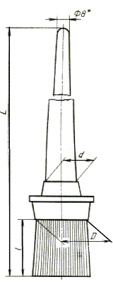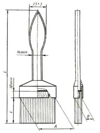 Дата введения 01.01.88 Настоящий стандарт распространяется на кисти и щетки, предназначаемые для малярных работ в строительстве. 1. Технические требования1.1. Основные размеры 1.1.1. Малярные кисти и щетки должны изготовляться в соответствии с требованиями настоящего стандарта по рабочим чертежам и образцам-эталонам, согласованным с базовой организацией по стандартизации и утвержденным в установленном порядке. 1.1.2. Малярные кисти и щетки должны изготовляться следующих типов: КР, КРС, КРО - кисти-ручники, предназначаемые для грунтовки и окраски поверхностей; КП - кисти плоские, предназначаемые для грунтовки, окраски, а также для покрытия поверхностей лаком; КМ - кисти маховые, предназначаемые для промывки, грунтовки, побелки и окраски поверхностей; КМА - кисти-макловицы, предназначаемые для окраски поверхностей водными растворами; КФ - кисти флейцевые, предназначаемые для обработки (флейцевания) свежеокрашенных поверхностей путем сглаживания следов кисти; КФК - кисти филеночные, предназначаемые для выполнения отделочных операций; ЩТ - щетки-торцовки, предназначаемые для обработки свежеокрашенных поверхностей и придания им шероховатоматового вида. 1.1.3. Основные размеры кистей и щеток должны соответствовать указанным на Черт. 1 - 11, 17 а и в табл. 1 - 6. Примеры исполнения обоймы кистей типов КР, КРС, КРО, КФ и КП приведены на Черт. 15 - 18 приложения 1. Кисти типоразмеров КР50, КР55, КРС50, КРС55, КРО50 - КРО60 и типа КМ независимо от длины пучка должны изготовляться с обвязкой пучка. Кисти типоразмеров КР20 - КР45, КРС20 - КРС45 и КРО20 - КРО45 должны изготовляться с обвязкой пучка в случае, если длина пучка превышает указанную в табл. 1 и 2 более чем на 7 мм. При изготовлении кистей с обвязкой пучка рекомендуется применять съемные вкладыши. Длина обвязки пучка должна быть не менее величины превышения длины пучка, указанной в табл. 1 и 2. (Измененная редакция, Изм. № 1). 1.1.4. Условные обозначения кистей и щеток должны состоять из условных обозначений типов или типоразмеров, исполнения кистей и обозначения настоящего стандарта. Пример условного обозначения маховой кисти типа КМ: Кисть маховая КМ ГОСТ 10597-87 То же, кисти-ручника типоразмера КР20: Кисть-ручник КР20 ГОСТ 10597-87 То же, кисть флейцевая типоразмера КФ25 исполнения 1: Кисть флейцевая КФ25-1 ГОСТ 10597-87 1.2. Характеристики (свойства) Прочность соединения должна определяться методом вырывания пучка волокон диаметром 5 мм с усилием не менее: 147 Н (15 кгс) - для кистей типов КР, КРС, КРО, КП, КМ, КФ, КФК; 49 Н (5 кгс) - для кистей и щеток типов КМА, ЩТ. 1.2.2. Колодку щетки типа ЩТ допускается изготовлять без накладки при условии соблюдения прочности соединения ручки с колодкой в соответствии с п. 1.2.1. При изготовлении ручек кистей типов КП и КФ из полиамида, а обоймы из жести допускается детали кистей не соединять гвоздями при условии выполнения требований п. 1.2.1. Для крепления обоймы с ручкой и вкладышем кистей типа КФ допускается применять металлические скобы. Ручки кистей типа КФ допускается изготовлять цельнолитыми с обоймой и вкладышами. Кисть-ручник типа КР Черт. 1 Кисть-ручник типа КРС