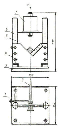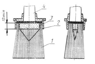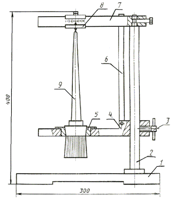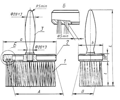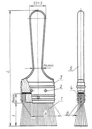 Если число дефектных кистей или щеток в первой выборке больше приемочного числа, но меньше браковочного, проводят вторую выборку. Партию кистей или щеток принимают, если число дефектных кистей или щеток в двух выборках меньше или равно приемочному числу, и бракуют, если число дефектных кистей или щеток в двух выборках больше или равно браковочному числу. 2.5. Проверка кистей или щеток на соответствие требованиям пп. 1.2.1 и 1.3.4 должна проводиться не реже одного раза в год или при замене применяемого сырья, или технологии изготовления, для чего от партии отбирают 0,1 %, но не менее 3 шт. кистей или щеток. Если при проверке отобранных кистей или щеток хотя бы одно изделие не будет удовлетворять требованиям пп. 1.2.1 и 1.3.4, следует проводить повторные испытания удвоенного числа изделий, отобранных из той же партии. При неудовлетворительных результатах повторной проверки партии кистей или щеток приемке не подлежит. Результаты повторной проверки изделий являются окончательными. 2.6. Потребитель имеет право проводить контрольную проверку качества кистей и щеток, соблюдая при этом приведенный порядок отбора образцов и применяя методы испытаний, установленные настоящим стандартом. 3. Методы испытаний3.1. Размеры кистей, щеток и их деталей, а также требования, предусмотренные п.1.2.11, проверяют с помощью измерительных средств, погрешность измерения которых ±0,1 мм, и шаблонов. Кисти с обвязкой по п.1.2.11 не проверяют. (Измененная редакция, Изм. №1). Температуру воды измеряют термометром, погрешность измерения при этом ±1 °С. Испытания всех типов кистей и щеток, за исключением кистей типа КМА, проводят одним из следующих способов: - путем выдерживания по 1 ч поочередно в растворителях № 646 по ГОСТ 18188, Р-12 по ГОСТ 7827, растворах медного купороса и извести при температуре не ниже 20 °С; - путем выдерживания поочередно в ацетоне, бензоле, растворах медного купороса и извести в течение 8 ч в каждом из них. Кисти и щетки типов КП, КФ, КФК и ЩТ в растворах медного купороса и извести не испытывают. Испытание кистей типа КМА проводят путем выдерживания поочередно в растворах медного купороса и извести в течение 8 ч. Концентрация раствора медного купороса должна быть не менее 10 %, раствор извести должен быть с осадком. После проведения испытаний по пп. 3.2 и 3.3 и высушивания у пучков не допускается появления закрученности, усадки по длине и ломкости. Примечание. Кисти и щетки после проведения каждого этапа испытаний должны быть промыты в проточной воде. 3.4. Прочность соединения пучков кистей с обоймой и ручкой, а также колодок с пучком, ручкой или держателем определяют на разрывной машине с усилием разрыва 300 Н (30 кгс) или при помощи динамометра по ГОСТ 13837 с использованием специального приспособления, указанного на черт. 12. 1 - патрон; 2 - оправка; 3 - рукоятка; 4 - кисть; 5 - зона замера Черт. 12 Испытания проводят в следующей последовательности: - пучок кисти или щетки диаметром 5 мм, выбранный в периферийной части кисти, вставляют в отверстие патрона и при помощи подвижного конуса закрепляют в нем. После этого кисть или щетку с указанным приспособлением устанавливают на разрывную машину, закрепляя в ней ручку кисти и приспособление, или используют динамометр и снимают показатели на машине или динамометре. Показатели должны соответствовать значениям, приведенным в п.1.2.1. Определени