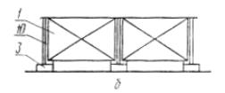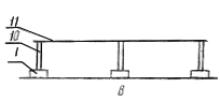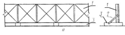 Черт. 1 Ограждения с доборными элементами Черт. 2 1 - панель ограждения; 2 - подкос панели; 3 - опора (лежень); 4 - панель тротуара; 5 - горизонтальный элемент перил; 6 - поручень; 7 - стойка перил; 8 - панель козырька; 9 - подкос козырька; 10 - стойка ограждения; 11 - пеньковый или капроновый канат, проволока 2.2.8. Панели козырька должны обеспечивать перекрытие тротуара и выходить за его край (со стороны движения транспорта) на 50 - 100 мм. 2.2.9. Конструкция панелей тротуара должна обеспечивать проход для пешеходов шириной не менее 1,2 м. 2.2.10. Конструкция панелей козырьков и тротуаров должна обеспечивать сток воды с их поверхностей в процессе эксплуатации. 2.2.11. Тротуары ограждений, расположенных на участках примыкания строительной площадки к улицам и проездам, должны быть оборудованы перилами, устанавливаемыми со стороны движения транспорта. 2.2.12. Конструкция перил должна состоять из стоек, прикрепленных к верхней части ограждения или козырьку, а также поручня и промежуточного горизонтального элемента, расположенных, соответственно, на высоте 1,1 и 0,5 м от уровня тротуара. Поручни должны крепиться к стойкам с внутренней стороны. 2.2.13. Технологические допуски геометрических параметров элементов ограждений должны быть не ниже 6-го класса точности по ГОСТ 21779-82. 2.2.14. Способ соединения элементов ограждения должен обеспечивать удобство их монтажа, демонтажа, прочность при эксплуатации, возможность и простоту замены при ремонте. 2.2.15. Конструкция крепления элементов ограждения должна обеспечивать возможность установки его на местности, имеющей уклон до 10 % по линии установки ограждения. 2.2.16. Элементы деревянных ограждений, соприкасающиеся с грунтом, должны быть антисептированы. Металлические детали соединений и креплений должны иметь антикоррозионную защиту. 2.2.17. Ограждения должны быть окрашены в соответствии с принятым эталоном. Сигнальная окраска ограждений должна быть выполнена по ГОСТ 12.4.026-76. 2.2.18 На элементах и деталях ограждений не допускается наличие острых кромок, заусенцев и неровностей, которые могут стать причиной травматизма. 2.3. Требования устойчивости к внешним воздействиям 2.3.1. Нормативная равномерно-распределенная нагрузка для тротуарных панелей должна приниматься 200 кгс/м2. 2.3.2. Скоростной напор ветра должен приниматься: для ограждений, эксплуатируемых в Приморском крае, Камчатской и Сахалинской областях, на побережьи Тихого и Северного ледовитого океанов - 100 кгс/м2. для ограждений, эксплуатируемых в других районах страны, - 35 кгс/м2. 2.3.3. Вес снегового покрова на 1 м2 площади горизонтальной проекции козырька должен приниматься: для ограждений, эксплуатируемых в Приморском крае, Камчатской и Сахалинской областях, на побережьи Тихого и Северного ледовитого океанов - 150 кгс/м2; для ограждений, эксплуатируемых в других районах страны, - 70 кгс/м2; Коэффициент перегрузки при определении расчетной снеговой нагрузки должен приниматься равным 1,25. 2.4. Требования к надежности 2.4.1. Срок службы элементов ограждений (кроме панелей тротуаров) - не менее 10 лет. Срок службы панелей тротуара - не менее 5 лет. 2.5. Требования к материалам 2.5.1. Материалы, применяемые для изготовления ограждений, должны удовлетворять требованиям соответствующих стандартов или технических условий (ТУ). 2.5.2. Соответствие материалов предъявляемым требованиям должно подтверждаться 