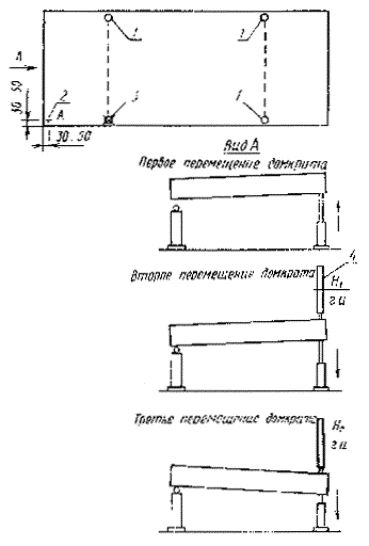 точек, снятым после натяжения стержней, определяют превышения h2 и 3.4.3. Прогиб (выгиб) формы от силы натяжения арматуры в миллиметрах определяют по формуле (5). 3.4.4. Сближение упоров по оси равнодействующих усилий в предварительно напряженной арматуре Dl в сантиметрах определяют по формуле где уN - деформация формы, определенная при испытании, см; е - эксцентриситет приложения силы N относительно центральной плоскости, см; N - фактическая сила натяжения арматуры, определенная при испытании, Н (кгс); l - расстояние между внутренними гранями упоров, см; Е - модуль упругости стали, Н/см2 (кгс/см2); F - площадь поперечного сечения поддона, см2. Примечание. Знак плюс перед первым слагаемым принимают, когда под воздействием силы N форма изгибается вниз, а минус - при выгибе формы. 3.5. Допускается определение деформативности формы от продольной нагрузки с помощью индикаторов по рекомендуемому приложению 3. 4. ОПРЕДЕЛЕНИЕ ПРОГИБА СВОБОДНОГО УГЛА ПОДДОНА ПРИ ДИАГОНАЛЬНОМ ОПИРАНИИ4.1. Метод определения прогиба свободного угла поддона симметричной или несимметричной формы при диагональном опирании (опирание по двум точкам, расположенным по концам диагонали) основан на измерении с помощью нивелира вертикальных перемещений угла поддона, под которым при испытании установлен домкрат. 4.2. Аппаратура 4.2.1. Для проведения испытания применяют: нивелир по ГОСТ 10528-76; подставку для нивелира по ГОСТ 16740-79; штатив для нивелира по ГОСТ 11897-78; нивелирную рейку по рекомендуемому приложению 1; гидравлический или механический домкрат, предельное усилие которого не меньше половины массы формы. 4.3. Подготовка и проведение испытания 4.3.1. Симметричную форму устанавливают на четыре опоры высотой 300 - 500 мм, расположенные под устройствами для строповки или колесами (при испытании формы-вагонетки). В качестве одной опоры используют домкрат, а три неподвижные опоры должны обеспечивать точечное опирание (черт. 3). 4.3.2. Несимметричную по массе форму устанавливают на четыре опоры, из которых две - домкраты. Два домкрата при испытании несимметричной формы следует располагать по концам одной из диагоналей. Диагональ выбирают в зависимости от положения несимметричной массы: ближайшей к более тяжелой части формы должна быть одна из неподвижных опор. Допускается испытание несимметричной формы с одним домкратом, располагая его при испытании последовательно в двух углах (с заменой домкрата на неподвижную опору). 4.3.3. Перед опусканием одного из углов формы противоположный угол должен быть предварительно пригружен, чтобы компенсировать возможную разность масс двух половин формы. Симметричную по массе форму пригружают грузом массой 30 - 40 кг, а несимметричную форму допускается не пригружать, если опускается более легкая половина формы. 4.3.4. Для приведения формы в исходное положение, при котором определяют отметку точки А (см. черт. 3), домкрат выдвигают до отрыва поддона от смежной опоры (первое перемещение). 4.3.5. Второе перемещение домкрата должно обеспечить опускание поддона на смежную опору. Схема расположения опор и последовательность перемещения домкрата 1 - неподвижная опора; 2 - точка нивелирования; 3 - домкрат; 4 - нивелирная рейка; г, и - горизонт инструмента (нивелира) Черт. 3 Момент соприкосновения поддона с опорой определяют листом тонкой бумаги, уложенным на опору, по усилию, приклады