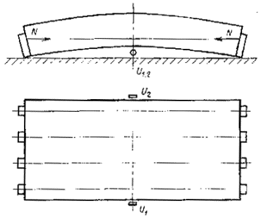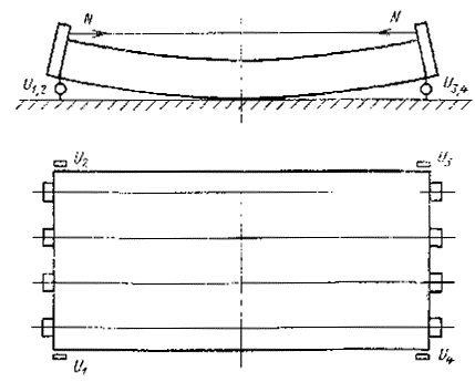 где Q - вес формы, Н (кгс); l - расстояние между опорами при их расположении по краям, см; h1 и h2 - превышения, мм, по формулам (1) и (2) настоящего приложения. 8. При испытании несимметричной формы, у которой разность масс двух половин поддона может быть компенсирована соответствующим пригрузом двух неподвижных опор, применяют методику, описанную в пп. 1 - 7 настоящего приложения, однако испытание проводят в два этапа с последовательным смещением к середине одной и второй пары крайних опор. При испытании несимметричной формы в формулу (3) вводят среднюю разность перемещений (h1 - h2), определенную по результатам подсчета h1 и h2 на двух этапах испытаний. ПРИЛОЖЕНИЕ 3Рекомендуемое ОПРЕДЕЛЕНИЕ ДЕФОРМАТИВНОСТИ ФОРМЫ ОТ ПРОДОЛЬНОЙ НАГРУЗКИ С ПОМОЩЬЮ ИНДИКАТОРОВ1. Для проведения испытания применяют индикаторы по ГОСТ 577-68. 2. Форму для испытания устанавливают на сборочную плиту или пол цеха. 3. Места установки индикаторов зависят от характера деформации при приложении продольной нагрузки. Если под действием момента, создаваемого силой натяжения арматуры, приподнимаются торцы формы, то на расстоянии 30 - 50 мм от краев (черт. 1 настоящего приложения) устанавливают четыре индикатора, а если под действием момента форма приподнимается в середине, то по поперечной оси (черт. 2 настоящего приложения) устанавливают два индикатора. 4. При установке штоки индикаторов, закрепленных в стойках, должны упираться в нижние полки продольных швеллеров или выступающие наружу детали формы, а стойки - закрепляться на плите или к полу так, чтобы полностью исключить перемещение прибора в процессе испытания. 5. После снятия начальных отсчетов по индикаторам производят натяжение арматуры и определяют усилия в ней (пп. 3.3.3 и 3.3.5 настоящего стандарта). Схема расположения индикаторов при прогибе формы ui - номер индикатора Черт. 1 Схема расположения индикаторов при выгибе формы Ui - номер индикатора Черт. 2 6. Определяют деформацию формы от силы натяжения арматуры уN в миллиметрах по формуле