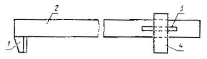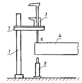 1 - стойка; 2 - уголок (измерительная база); 3 - штангенциркуль; 4 - форма; 5 - домкрат ПРИЛОЖЕНИЕ 5Рекомендуемое ШТАНГЕНИНСТРУМЕНТШтангенинструмент для измерения расстояния между наружными гранями бортов выполняют в виде балки (деревянный брус, стальная труба, угольник из алюминиевого сплава и т.п.) и двух упоров - неподвижного и подвижного. Подвижный упор должен перемещаться в пределах участка, на котором прикреплена линейка с миллиметровыми делениями.