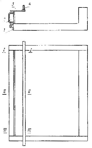 1 - неподвижный упор; 2 - балка (брус, труба); 3 - линейка с миллиметровыми делениями; 4 - подвижной упор ПРИЛОЖЕНИЕ 6Рекомендуемое ОПРЕДЕЛЕНИЕ ПРОГИБА БОРТА С ИСПОЛЬЗОВАНИЕМ ИЗМЕРИТЕЛЬНОЙ БАЗЫ1. Для выявления прогиба борта отсчитывают расстояния от него до измерительной базы, в качестве которой используют деревянную рейку таврового сечения, сбитую из досок, или любой прокатный профиль (желательно из легкого сплава). Длина рейки должна превышать длину измеряемого борта, как минимум, на ширину двух бортов противоположного направления. 2. Расстояние от внутренней грани борта до рейки измеряют в тех же сечениях, что и при работе с штангенинструментом (п. 5.3.1 настоящего стандарта), до заполнения формы бетонной смесью и после завершения процесса формования (чертеж настоящего приложения). 3. Рейку устанавливают на борта противоположного направления на расстоянии 100 - 200 мм от измеряемого борта, при этом относительно него рейка занимает случайное положение. С помощью измерительной линейки по ГОСТ 427-75 или штангенциркуля по ГОСТ 166-80 измеряют расстояние до борта в трех сечениях. 4. Повторные измерения в тех же сечениях производят после завершения процесса формования при новом также случайном относительно борта положения рейки. Чтобы на точность измерений не влияла кривизна самой рейки, необходимо исключить ее смещение вдоль измеряемого борта (при повторной установке), для чего при первой установке рейки следует рисками отметить места ее опирания на борта противоположного направления. Измерение прогиба борта с помощью рейки