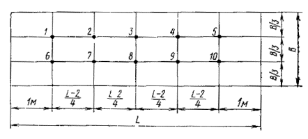 Примечание. В кварцевом песке, предназначенном для предприятий фарфоро-фаянсовой промышленности, определение суммы окислов калия и натрия (K2О + Na2O) обязательно. 2.2. По согласованию с потребителем допускается поставка песка с содержанием влаги не более 8% в объеме не более 15% от годовой поставки. 2.3. В кварцевом песке не допускается наличие посторонних примесей, видимых невооруженным глазом, за исключением примесей полевого шпата. 3. ПРАВИЛА ПРИЕМКИ3.1. Кварцевый песок принимают партиями. Партией считают количество кварцевого песка одного месторождения, одной марки, сопровождаемое одним документом о качестве. 3.2. Для проверки качества кварцевого песка пробы отбирают: из штабелей - от каждого штабеля; транспортируемого навалом - от каждого железнодорожного вагона. 3.3. Масса общей пробы должна быть не более 6 кг. 3.4. При несоответствии результатов испытаний требованиям настоящего стандарта хотя бы по одному из показателей проводят повторное испытание по этому показателю на удвоенном количестве разовых проб, отобранных от той же партии. Результаты повторных испытаний распространяются на всю партию. 4. МЕТОДЫ ИСПЫТАНИЯ4.1. Отбор и подготовку проб для испытаний производят следующим образом: от кварцевого песка из штабелей щупом на глубину 1 м из разных точек, расположенных на равном расстоянии в узлах сетки размером 2´2 м; от кварцевого песка, транспортируемого навалом, - из железнодорожных вагонов щупом на глубину 1 м из разных точек, расположенных на равном расстоянии. Масса разовой пробы должна быть не менее 0,6 кг каждая. 4.2. Количество точек отбора разовых проб кварцевого песка из одного железнодорожного вагона должно быть не менее 10. Расположение их указано на чертеже.