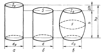 В случае, когда образец после сжатия приобретает форму бочки (черт. в) с образующей в виде дуги окружности, причем диаметр торца бочки сохраняется равным начальному диаметру образца, получается другое соотношение