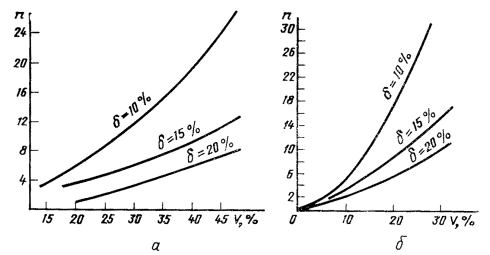 Число определений (n) для получения среднего значения предела прочности для инженерно-геологического элемента (слоя) с допустимой погрешностью и требуемой надежностью (доверительной вероятностью) находят в зависимости от коэффициента вариации породы по графикам (см. черт. а, б) или рассчитывают по формуле