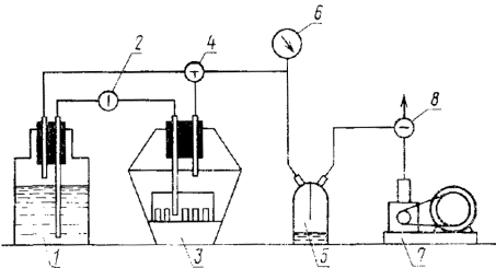 Постановлением Государственного комитета СССР по стандартам от 27 февраля 1985 г. №424 срок действия установлен с 01.07.86 до 01.07.91 Несоблюдение стандарта преследуется по закону Настоящий стандарт распространяется на горные породы, насыщенные в природных условиях нефтью, газом или водой и устанавливает метод определения коэффициента открытой пористости образцов горных пород жидкостенасыщением. Стандарт не распространяется на рыхлые горные породы. Сущность метода заключается в определении объема пустотного пространства образца (по разности масс сухого и насыщенного жидкостью образца), его внешнего объема (по разности масс насыщенного жидкостью образца в воздухе и в насыщающей жидкости) и вычислении коэффициента пористости путем деления первого объема на второй. 1. МЕТОД ОТБОРА ОБРАЗЦОВ1.1. Метод отбора образцов - по ГОСТ 26450.0-85. 2. ОБОРУДОВАНИЕ, ИНСТРУМЕНТЫ И РЕАКТИВЫ2.1. Оборудование, инструменты и реактивы - по ГОСТ 26450.0-85 со следующим дополнением: устройство для насыщения образцов (чертеж), конструкция которого предусматривает: Принципиальная схема устройства для насыщения образцов 1 - сосуд для насыщающей жидкости; 2 - запорный кран; 3 - емкость для насыщения образцов; 4 - трехходовой кран; 5 - ловушка для предотвращения попадания жидкости в вакуумный насос; 6 - вакуумметр; 7 - вакуумный насос; 8 - запорный кран вакуум-насоса и заполнения системы атмосферным воздухом возможность раздельного вакуумирования сухих образцов и насыщающей жидкости; герметичность (при отсутствии следов жидкости установка должна быть герметична при остаточном давлении 2,0-10-4 МПа); регулируемую подачу вакуумированной жидкости на дно сосуда с образцами для заполнения его снизу вверх; одновременное насыщение не менее 25-30 образцов массой менее 60 г или 3-5 образцов массой менее 800 г; возможность визуального контроля образцов и жидкости при вакуумировании и заполнении сосуда с образцами; возможность медленного приведения давления в установке к атмосферному при выключенном источнике вакуумирования. 2.2. В качестве рабочей жидкости применяют керосин, дистиллированную воду или модель пластовой воды. В ведомости результатов указывают насыщающую жидкость. 2.2.1. Рабочая жидкость не должна: вызывать набухания породы, отслаивания частиц, деформации образца; вступать с веществом породы в химическое взаимодействие; быть токсичной. 3. ПОДГОТОВКА К АНАЛИЗУ3.1. Образцы правильной формы изготавливают из куска керна путем его бурения, обрезки, обточки и шлифовки; неправильной формы - путем откалывания, отпиливания и подшлифовки острых углов. Слабосцементированные сыпучие образцы укрепляют тонким слоем клея, оставляя участки поверхности для прохождения насыщающей жидкости. 3.2. Керосин очищают от смол дву-, трехкратной фильтрацией его через силикагель марки АСК, в адсорбционных колонках или делительных воронках, заполненных на 2/3 объема силикагелем. Кроме того, керосин может быть очищен перегонкой или с помощью бентонитовой глины. Плотность керосина определяют с погрешностью до 0,01 г/см3. 3.3. Модель пластовой воды приготавливают путем растворения в дистиллированной воде солей, преобладающих в составе пластовой воды. Качественный и количественный солевой состав рассчитывают на основании химического анализа пластовой воды. 4. ПРОВЕДЕНИЕ АНАЛИЗА4.1. Для определения коэффициен